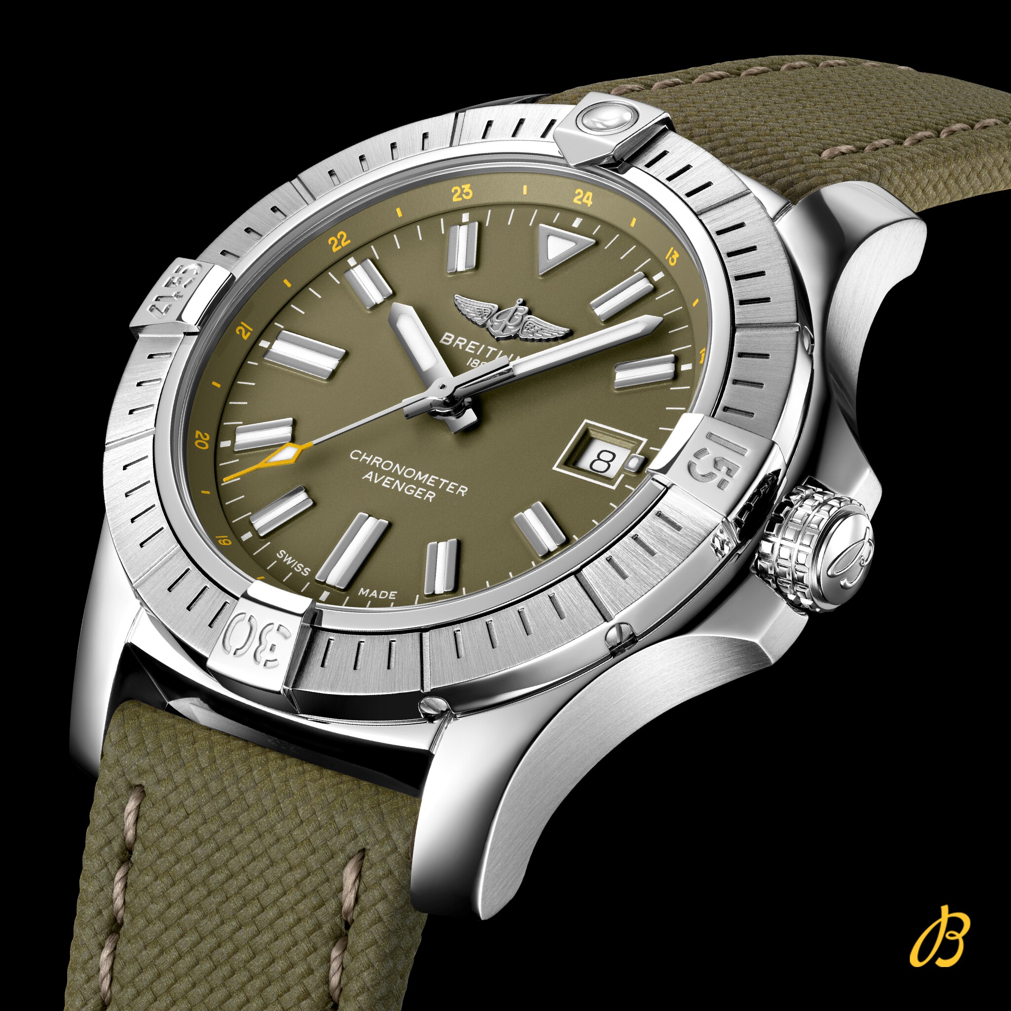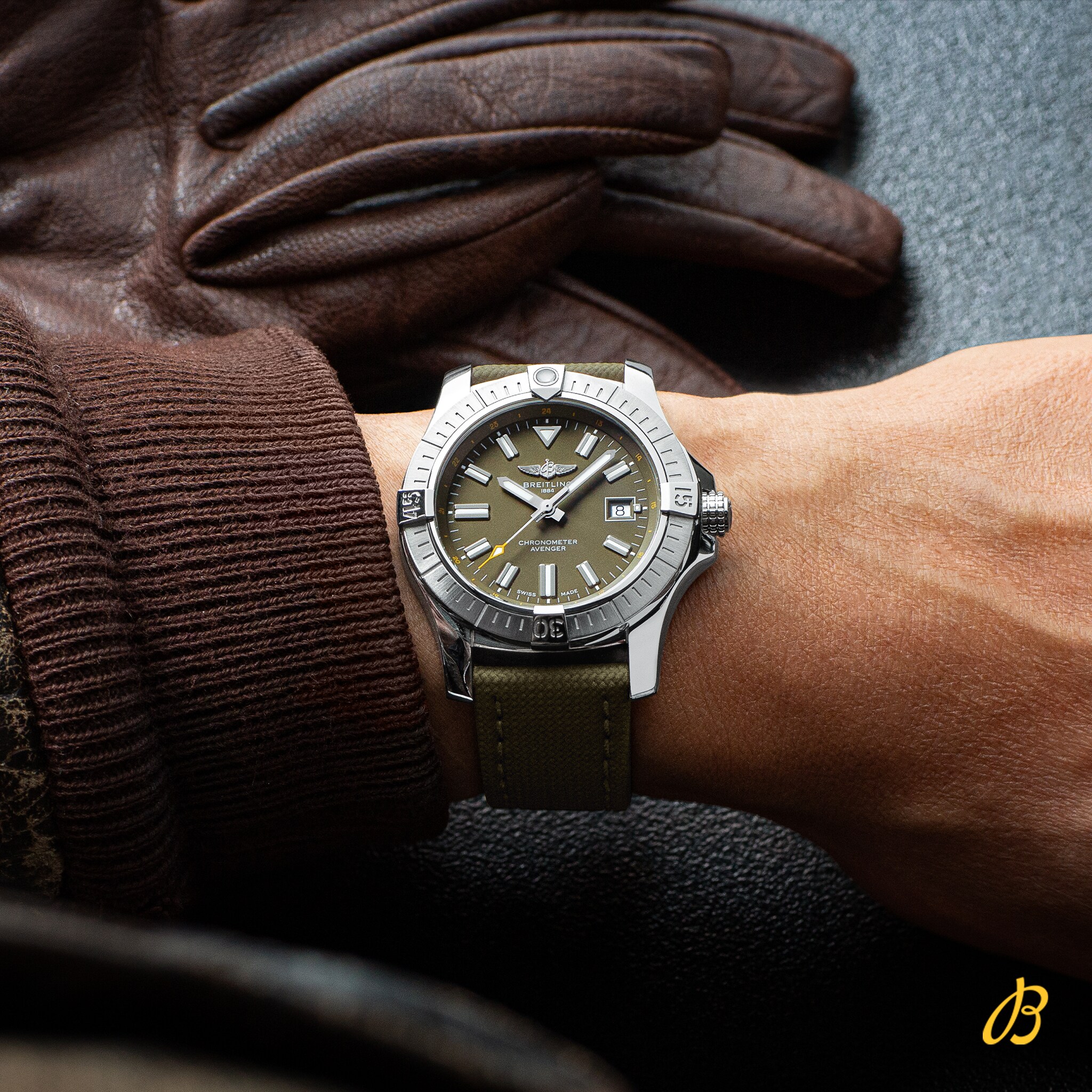 The Avenger Automatic 43 features a sturdy 43mm stainless-steel case, green dial and matching green military leather strap. Thanks to its rugged bezel and its special grip-pattern on the crown, the Avenger Automatic 43 can be easily operate wearing gloves.