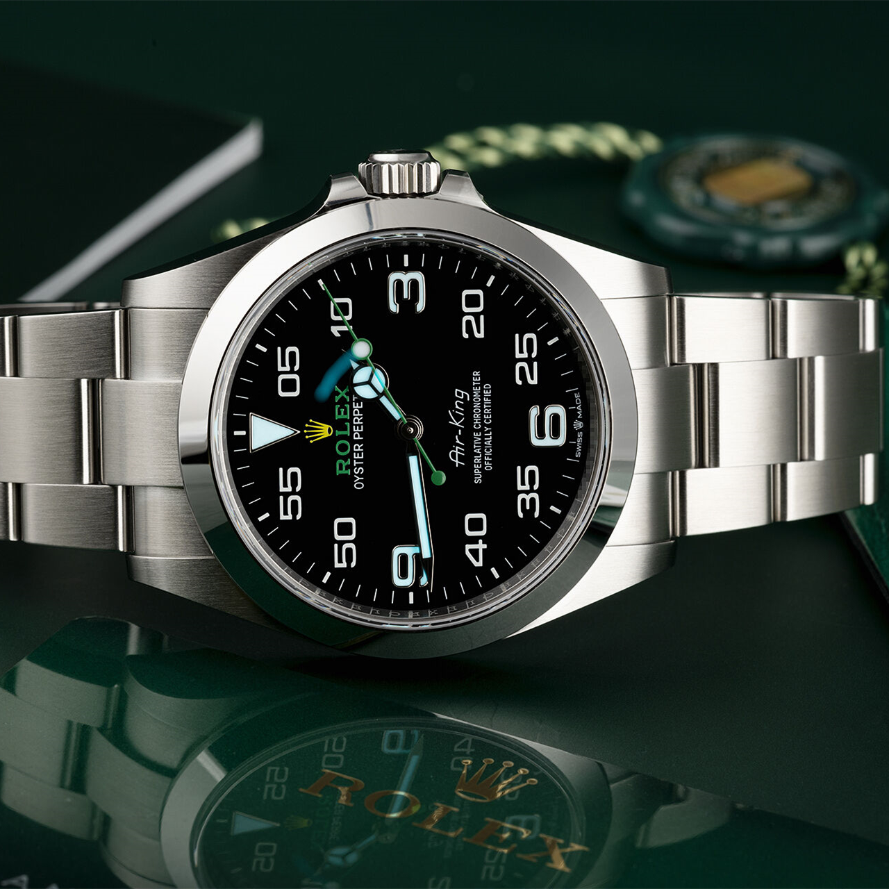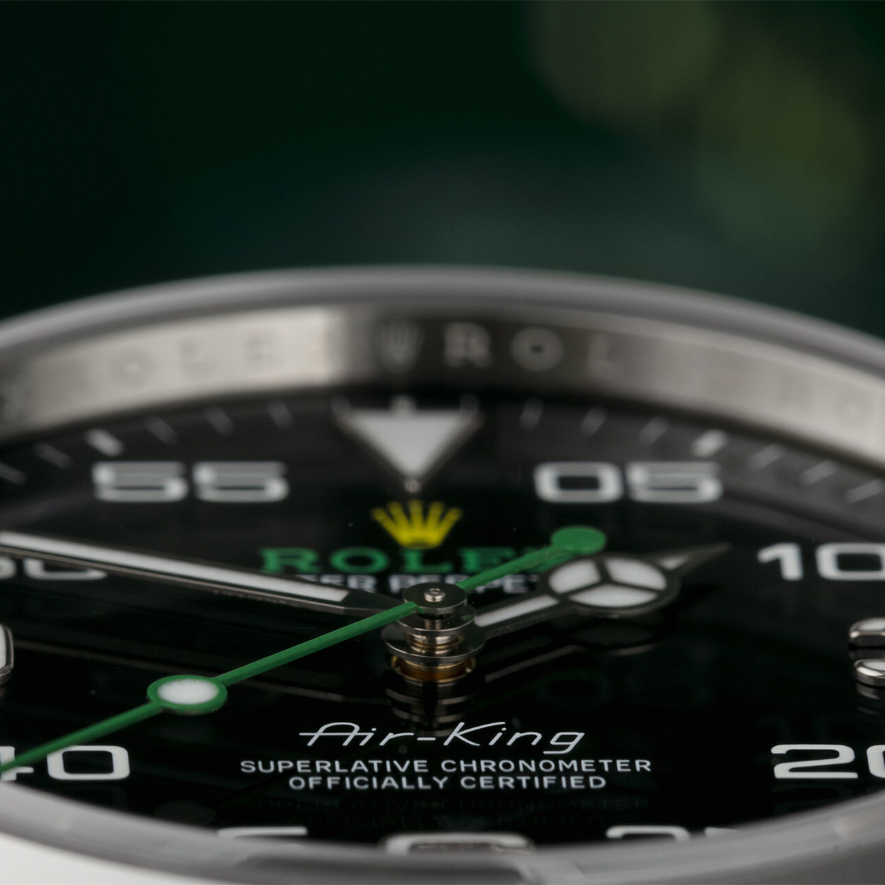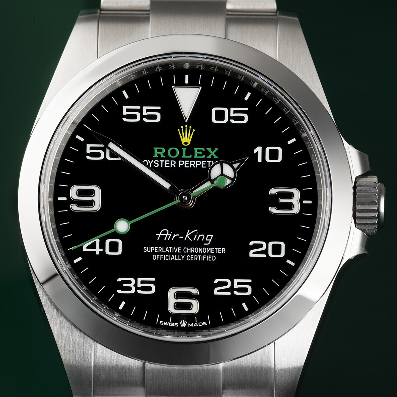 Rolex released a new edition of the sporty Air-King in 2022 under reference 126900. Much to the delight of even the most die-hard Rolex enthusiasts, the new Air-King now has its own case with newly-added crown guards and uses the next-generation caliber 3230 time-only dial. It also keeps the same Bloodhound-inspired dial that defined the modern Air-King in 2016 alongside its predecessor ref. 116900 with similar Arabic hour markers, centrally-mounted Mercedes hands, and a vibrant green and gold Rolex logo. The silvered Arabic hour markers seen on reference 116900 were replaced with sportier Chromalight Arabic markers, and a zero was added to the 5-hour marker. Lastly, the bracelet received Rolex's iconic Oysterlock safety clasp. Although seemingly small, these changes are typical of Rolex as the company continues its quest to perfect every aspect of the Rolex Air-King. There is no need to join a long waitlist.