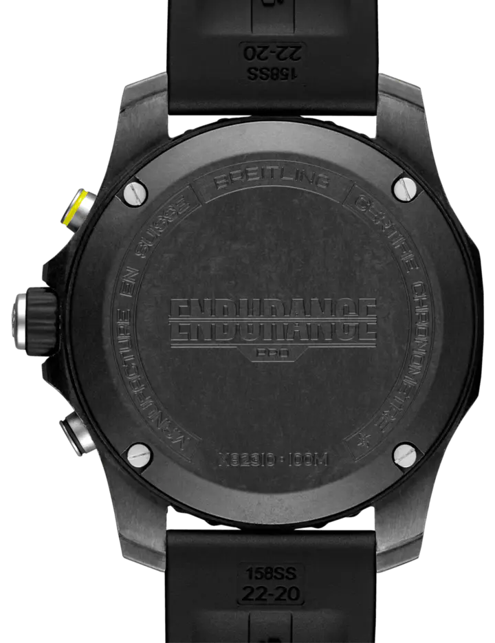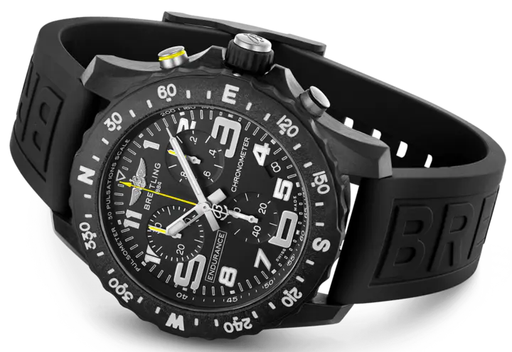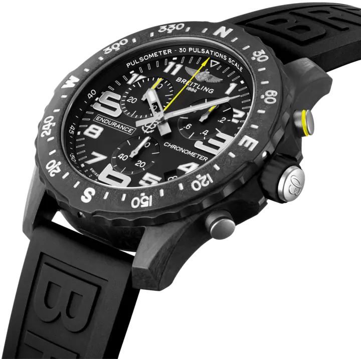 Breitling Watch Endurance Pro Black X82310E51B1S1. Designed to be both a lightweight watch for athletes and a casual, everyday sports chronograph, the Endurance Pro perfectly blends high precision & innovative technology with a vibrant & colourful design. It is the ultimate athleisure watch. Designed for men and women whose active lives blend a professional mindset with a sporty lifestyle, the Endurance Pro is equal to the challenges of a rigorous workout but fashionable enough for everyday wear. The Endurance Pro features an ultra light Breitlight case, a robust material 3.3 times lighter than titanium and 5.8 times lighter than stainless steel. Non-magnetic, thermally stable and hypoallergenic, Breitlight is highly resistant to scratches, traction and corrosion. It also has a touch that is warmer than metal and a slightly textured effect accentuating the originality of the design. Exclusive to Breitling, it is 100% Swiss made. Offered with a set of colourful dial and rubber straps fitting a Breitlight double tang type buckle, the Endurance Pro can also be paired with one of Breitling’s colourful Outerknown ECONYL yarn single piece strap. Powering the Endurance Pro is Breitling’s Caliber 82, a COSC certified SuperQuartz chronograph delivering exceptional precision.