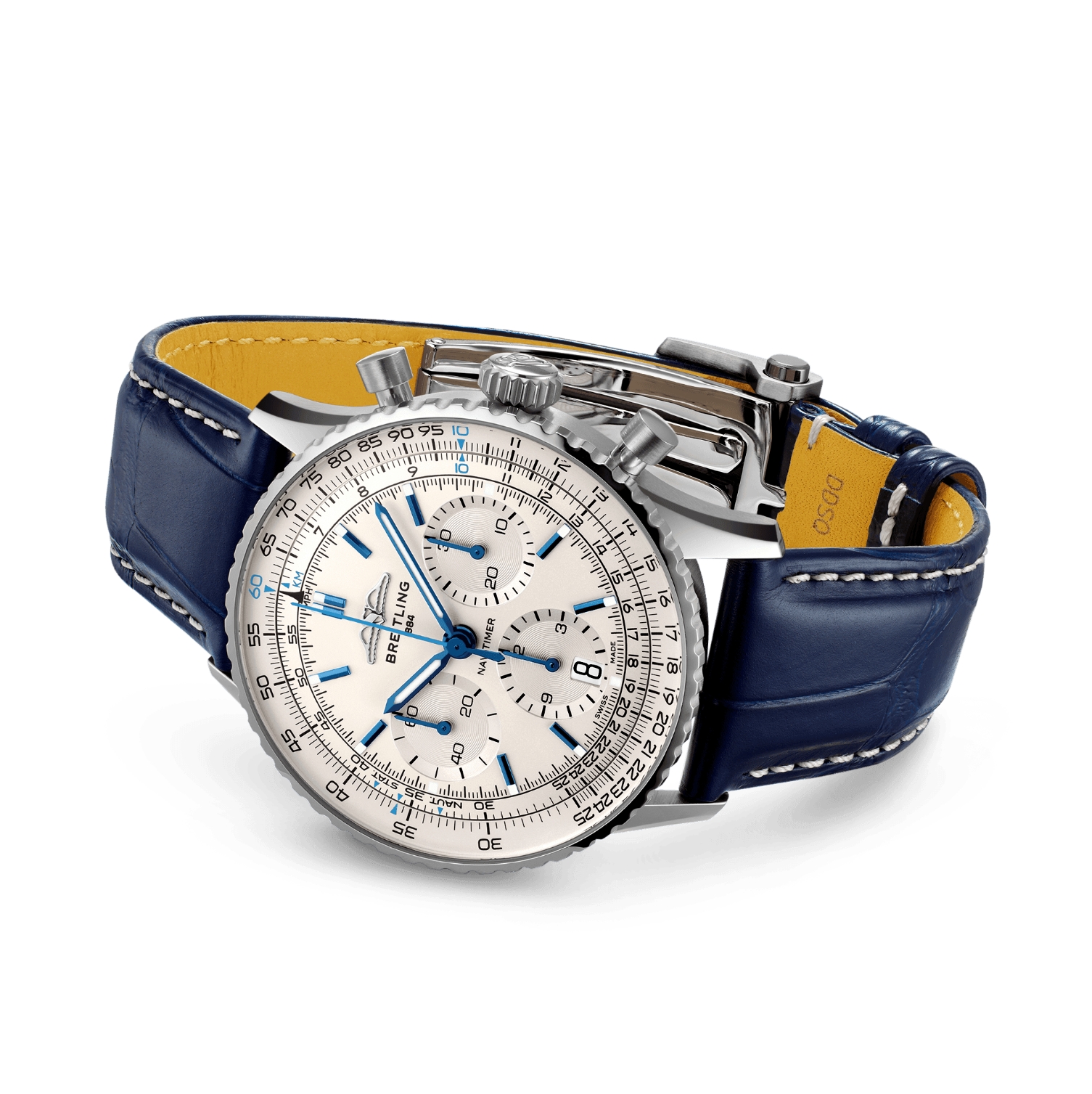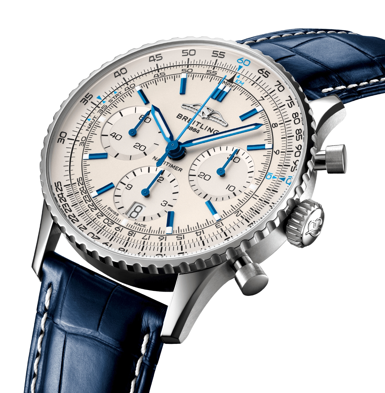 Breitling’s iconic pilot’s chronograph – for the journey. In 1952, Willy Breitling developed a wrist-worn chronograph with a circular slide rule that would allow pilots to perform all necessary flight calculations. Two years later, the Aircraft Owners and Pilots Association (AOPA) announced the design as its official timepiece. The “navigation timer” – or Navitimer – was born. The AOPA was (and remains) the largest pilots’ club in the world, counting nearly every US aviator among its ranks. As the defacto pilot’s watch throughout the glory days of civil aviation, the Navitimer was worn by airline captains and aircraft enthusiasts. It even made its way into space on the wrist of astronaut Scott Carpenter in 1962. And it wasn’t only pilots drawn to the watch’s irrepressible aesthetic. Celebrities of the day such as Miles Davis and Serge Gainsbourg were devotees, proving that the Navitimer had style as well as function. There have been many iterations of Breitling’s icon since its debut 70 years ago, but this new Navitimer captures its most classic features, while enhancing them with modern refinements. A flattened slide rule and a domed crystal create the illusion of a sleeker profile. Alternating polished and brushed metal elements give a lustrous, yet understated finish. Most notably, new colors in shades of blue, green and copper, define the updated dial options. And if there is one update sure to spark nostalgia, it’s the return of the AOPA wings to their original position at 12 o’clock. For 70 years, Breitling’s original pilot’s watch has been beloved by aviators and tastemakers in equal measure. Worn by astronauts in space and the biggest stars on earth, it is Breitling’s most iconic timepiece and one of the most recognizable watches of all time.