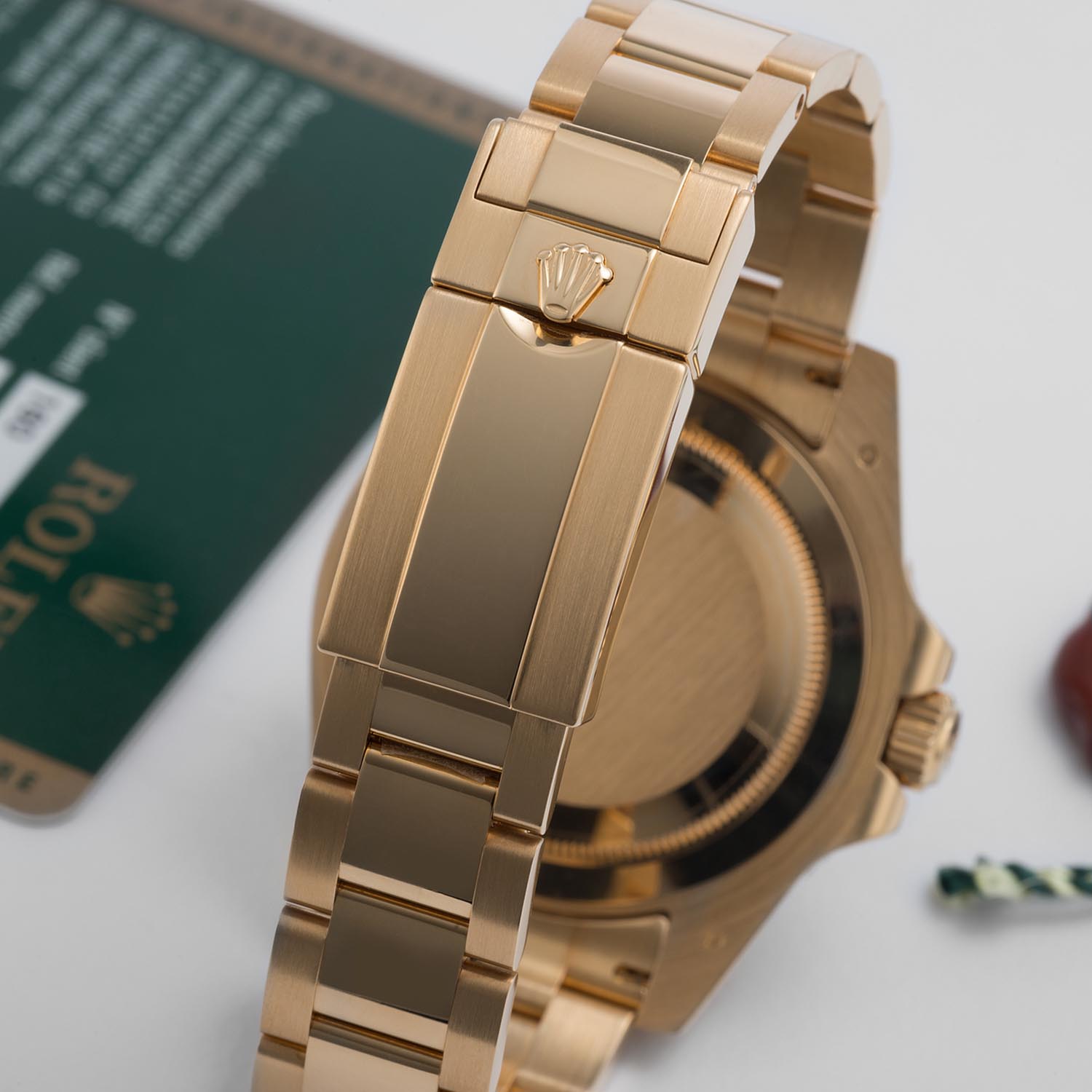 Rolex celebrated the 50th anniversary of their legendary GMT Master pilot's watch in 2005 by releasing the yellow gold ref. 116718 you see here. As an anniversary Rolex that also happened to be discontinued, this GMT is particularly sought-after on the secondary market. It also stands to hold its value alongside the price of gold and hails from the exclusive Rolex catalog - all excellent reasons to consider investing in this yellow gold stunner. Other features include a contemporary black ceramic bezel, Maxi hour markers and Mercedes hands, longer-lasting luminescent material, scratch-resistant sapphire, a Triplock waterproof screw-down crown, and the caliber 3186 Perpetual movement. Keep perfect time for anywhere in the world with this stylish gold Rolex GMT Master II ref. 116718 on your wrist.