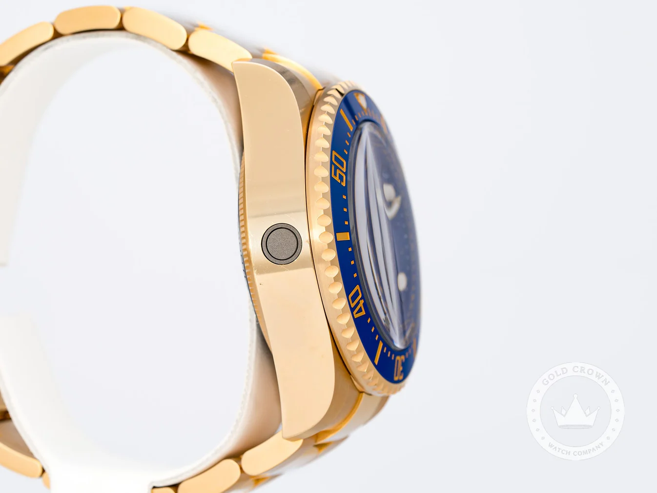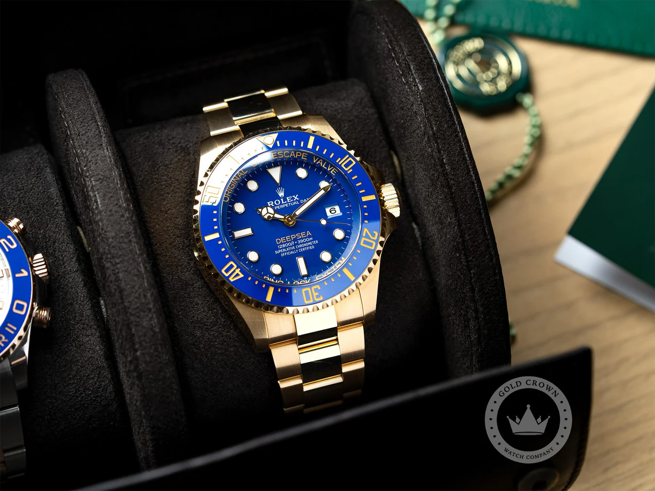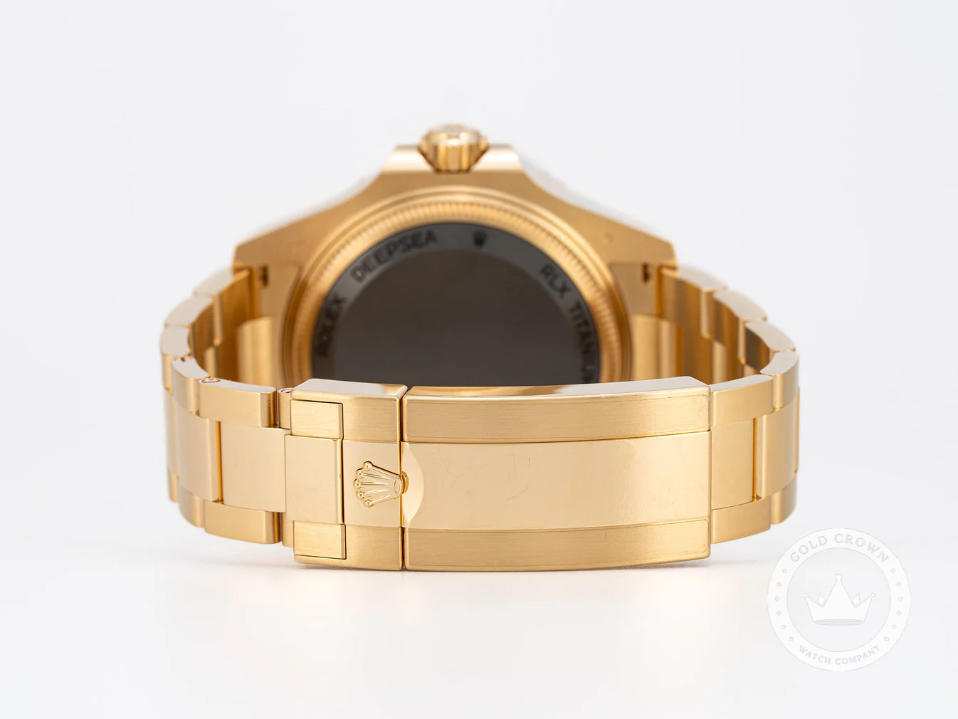 The 60-minute graduated, unidirectional rotatable bezel of the Rolex Deepsea enables divers to precisely and safely monitor their dive and decompression times. The triangular ‘zero’ marker of the graduation is visible in the dark thanks to an embedded capsule containing a luminescent material emitting a long-lasting blue glow. The graduation on the bezel is coated via PVD (Physical Vapour Deposition) with a thin layer of yellow gold. The blues found in the compression ring, the dial and the Cerachrom bezel insert combine to create a subtle oceanic palette that is accentuated by the 18 kt yellow gold of the case and the Oyster bracelet.
