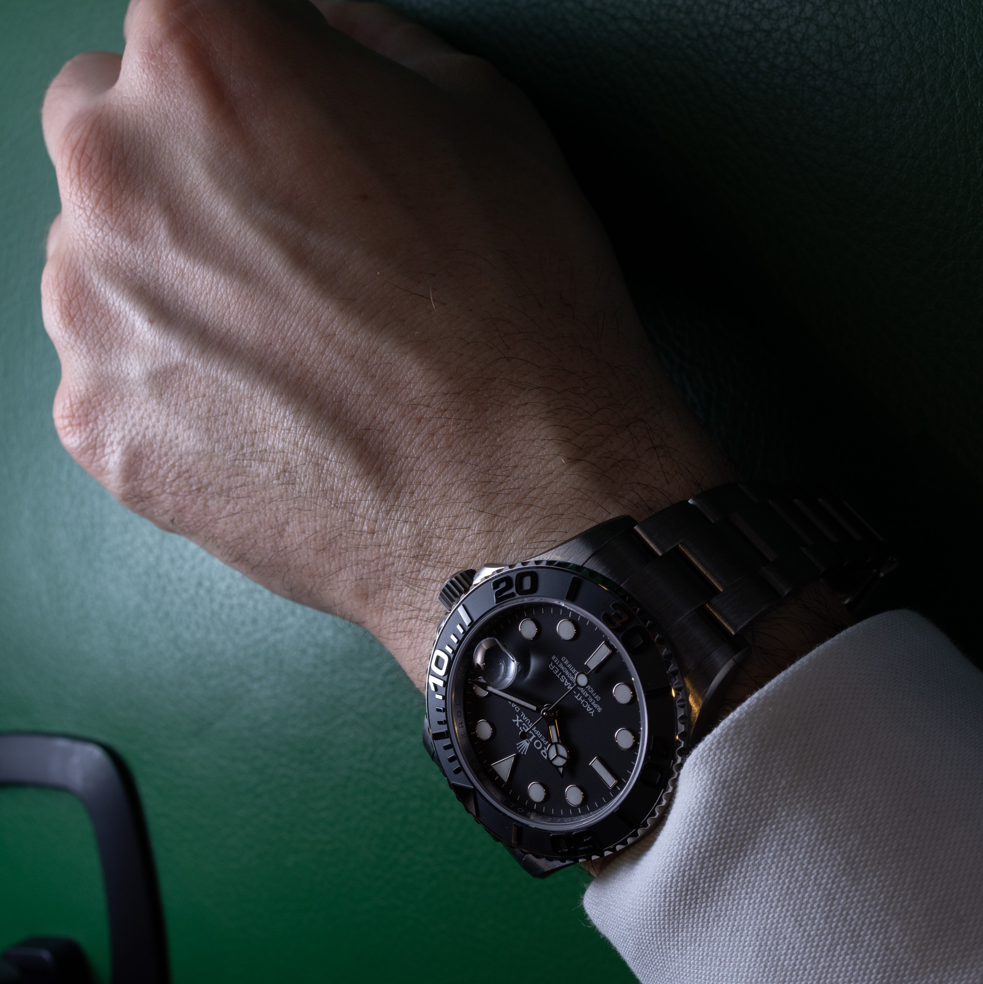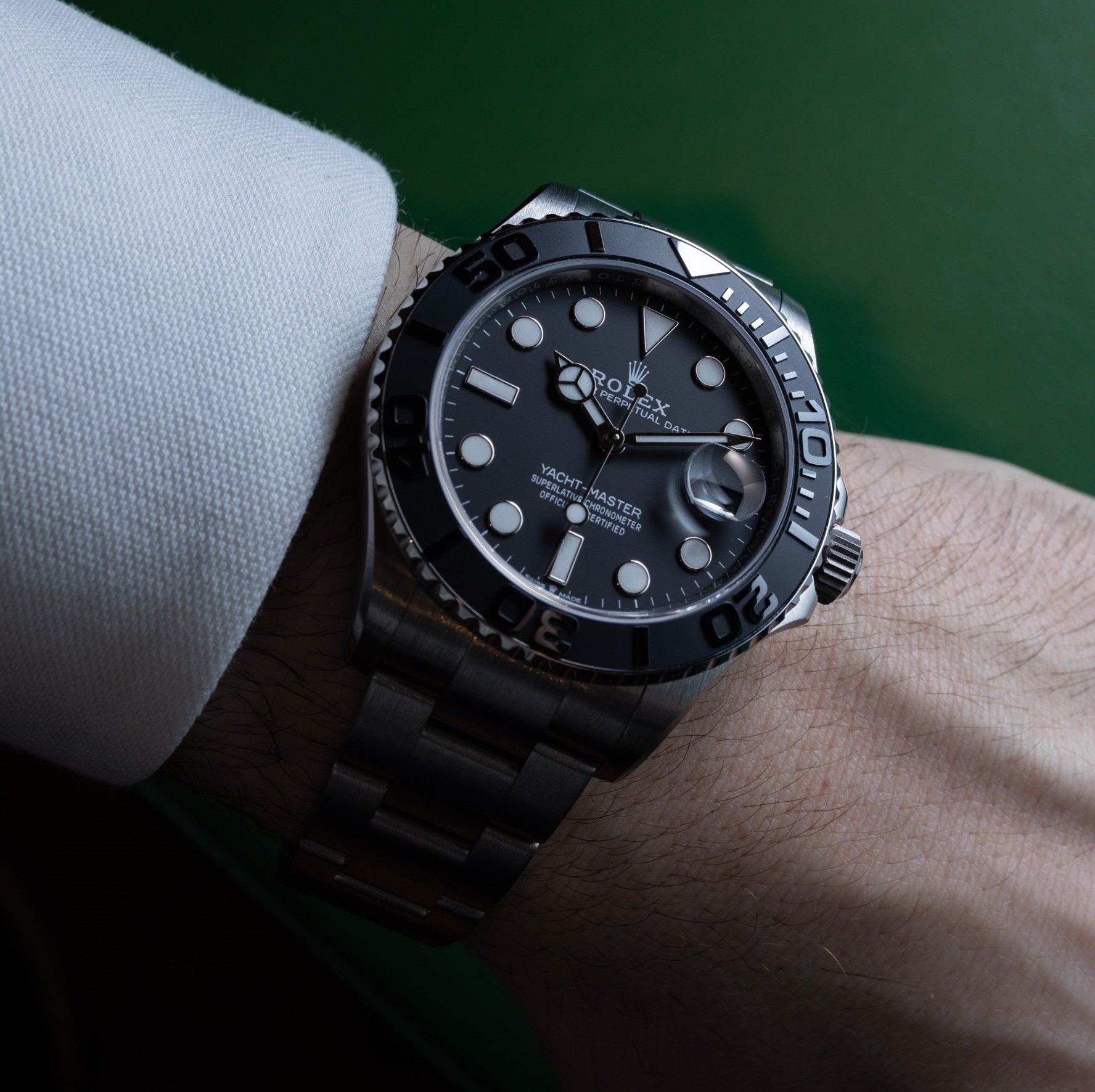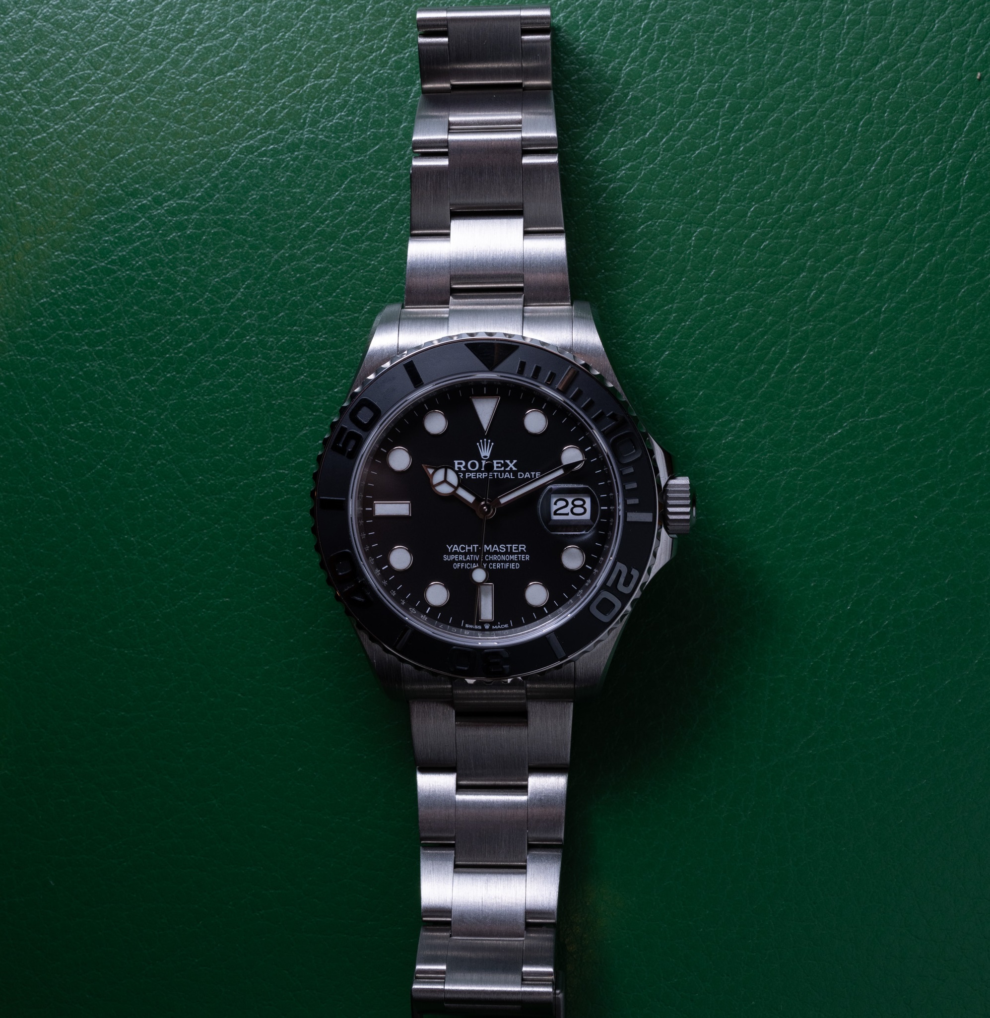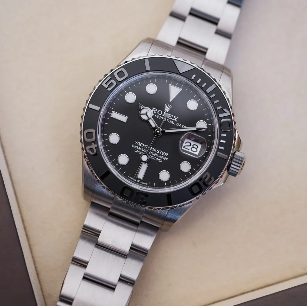 The dial of the Yacht-Master 42 reference 226627 is sleek and minimalist, featuring a black color scheme that exudes elegance and sophistication. The luminous hour markers and hands provide excellent legibility in any lighting conditions, ensuring that time can be easily read at a glance. The date window at 3 o'clock adds a practical feature to the watch, making it a versatile timepiece for everyday wear.