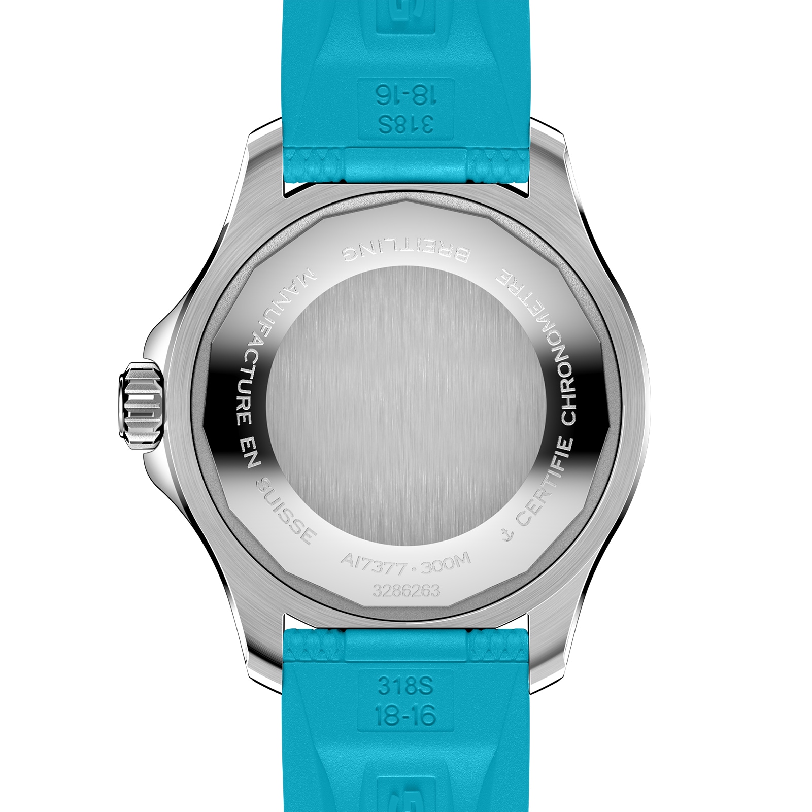 The unidirectional bezel frames a co-ordinating turquoise dial that offers maximum legibility, even beneath the surface of the waves.