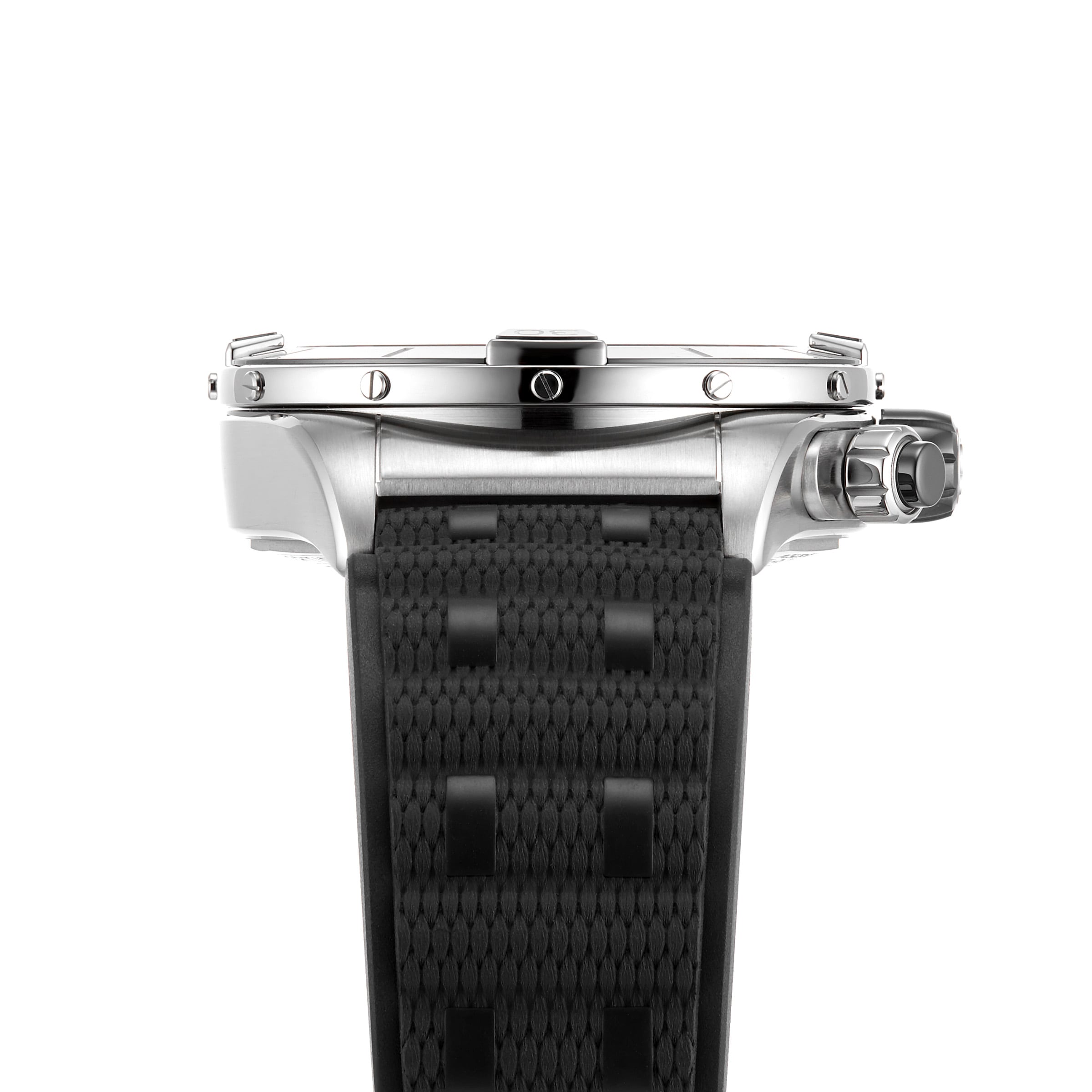 - 44mm stainless steel case with a black rubber Rouleaux-inspired bracelet