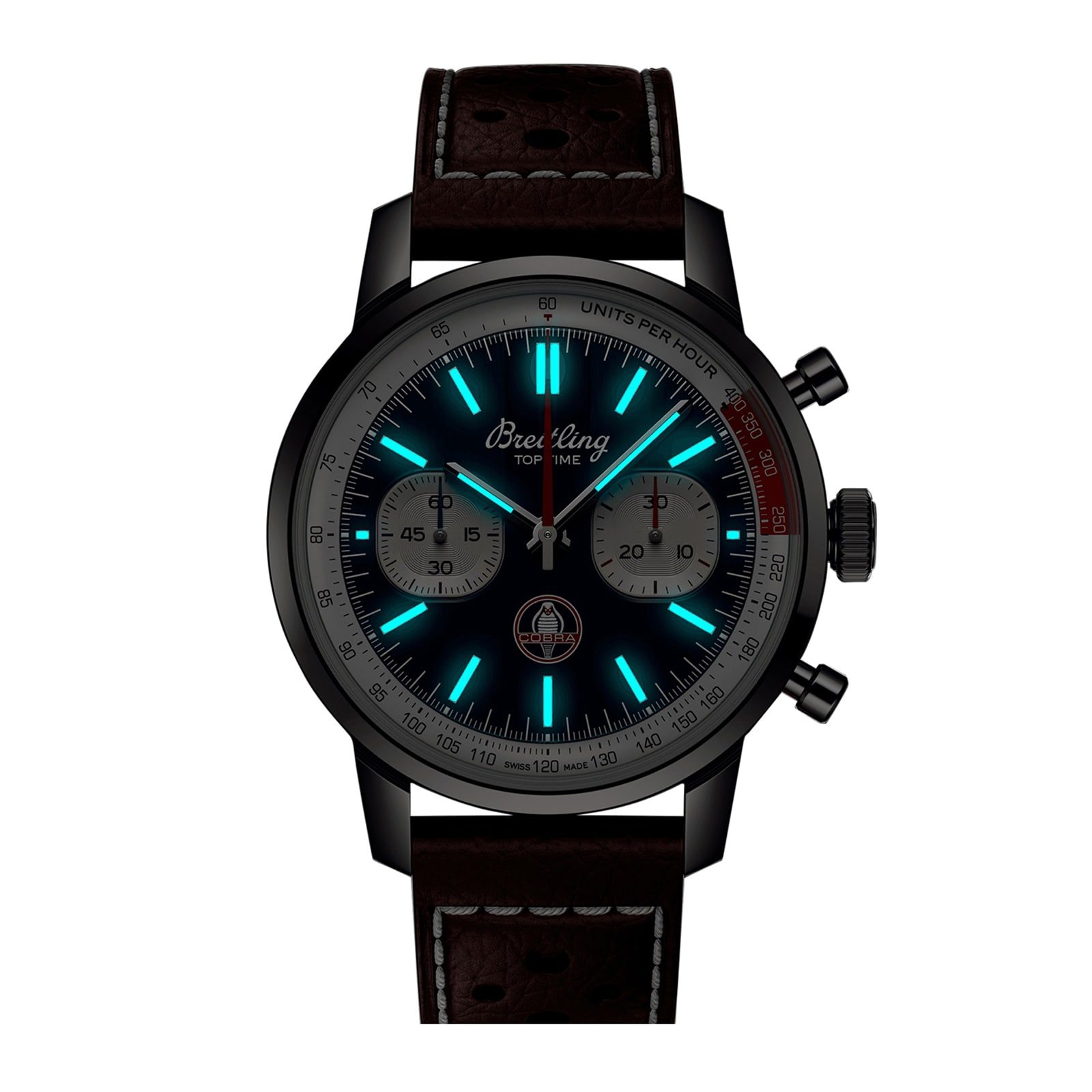 The Top Time B01 Shelby Cobra features the colours and emblem of its classic-car counterpart as well as a perforated leather racing strap, speed-measuring tachymeter scale and contrasting "squircle" (not quite square, not quite round) subdials that give the feel of a vintage dashboard gauges. It also comes with a brag-worthy engine under the hood: the exceptional Breitling Manufacture Caliber 01.