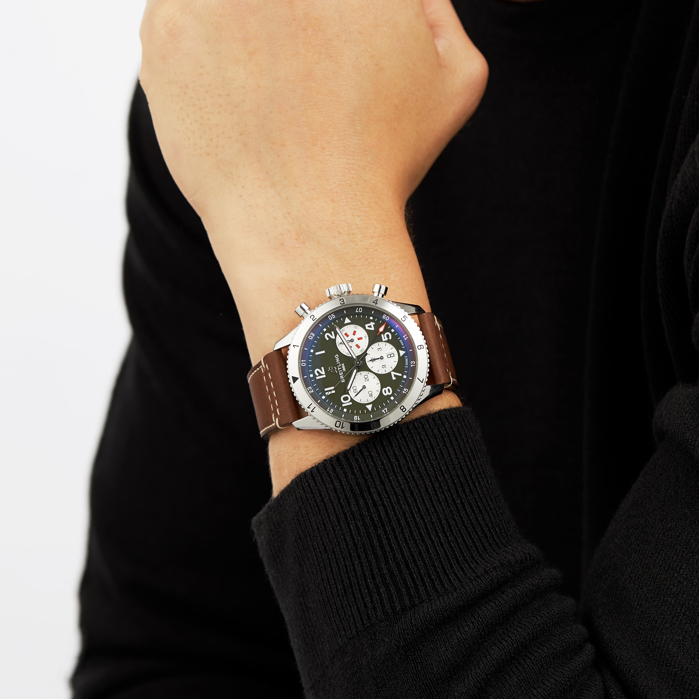 A chronometer certified by the COSC, this 46mm stainless steel model is presented on a brown leather strap with white topstitching to honour the seams found on classic flight gear.