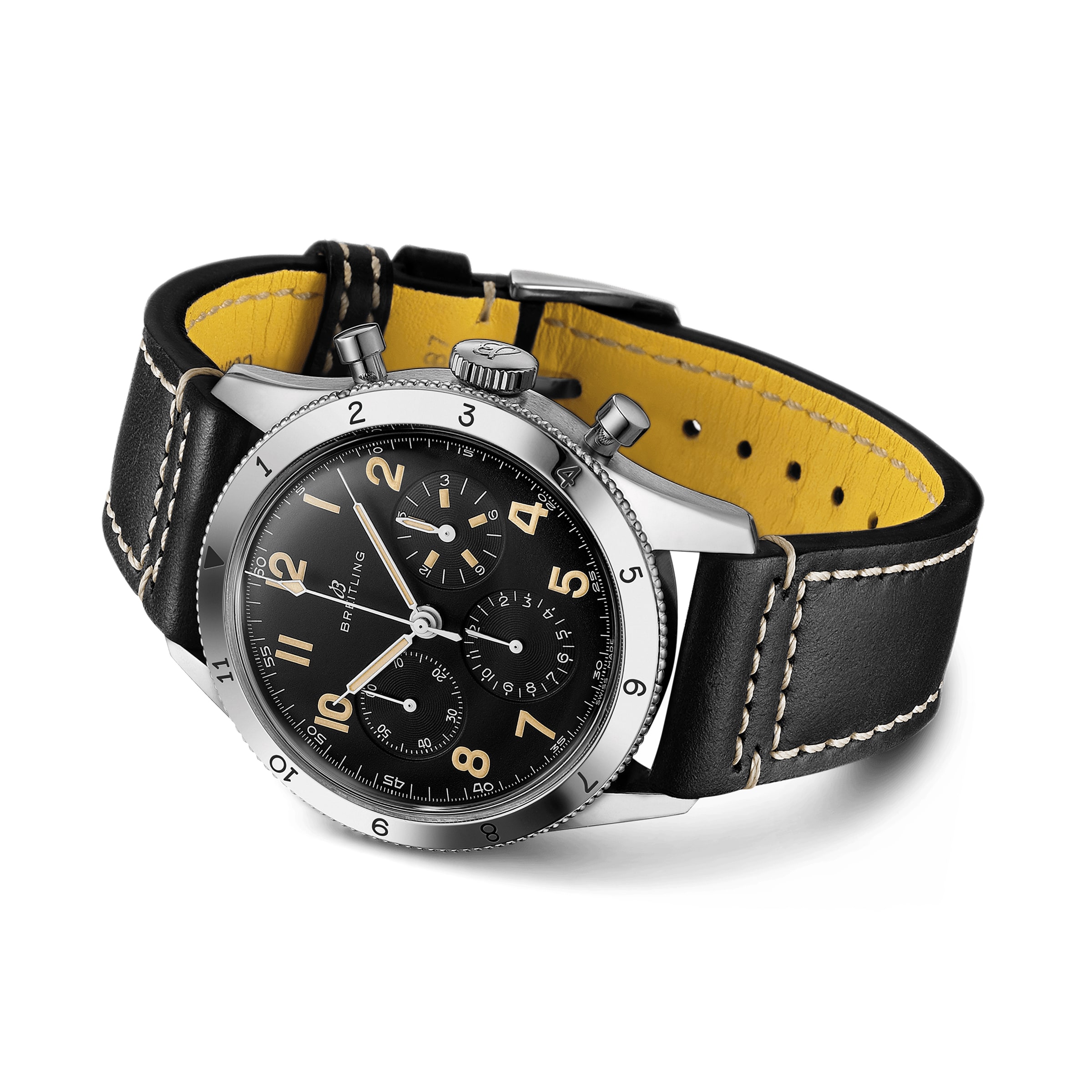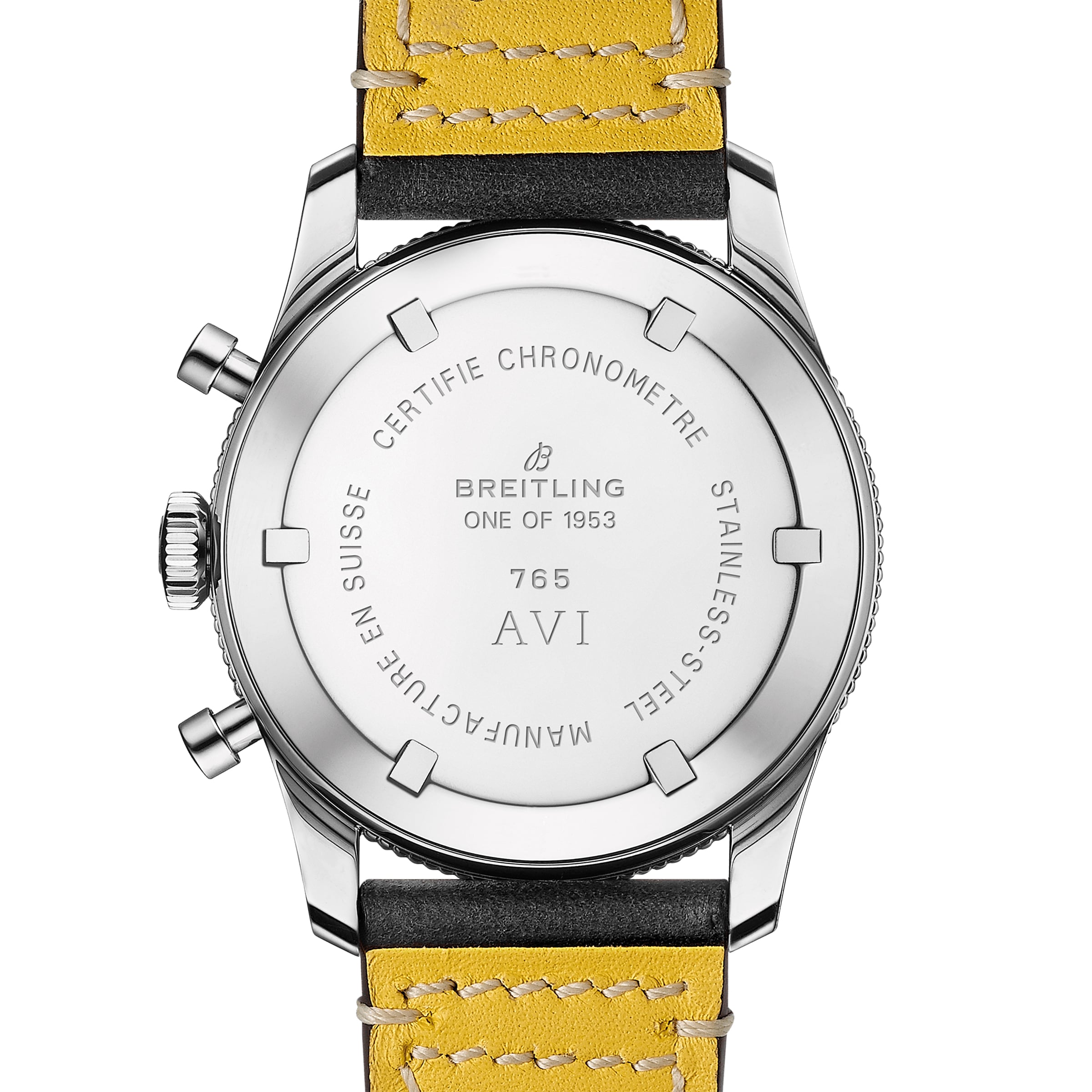 Back in the 1950s, the original Co-Pilot Ref. 765 AVI starred next to another Breitling icon: the Navitimer. With its bold design, engraved rotating bezel and extra legible dial the 765 AVI instantaneously became the perfect companion to the Navitimer as the rugged and reliable pilots' watch. Today, the AVI Ref. 765 1953 Re-Edition recreates to the very last detail one of the early executions of the Co-Pilot Ref. 765 AVI. Its all-black dial, protected by a highly-domed Hesalite crystal, has the same Arabic numerals as the original Co-Pilot from 1953, with tone-on-tone small seconds, 15-minute and 12-hour chronograph counters. The hand-applied Super-LumiNova color has been carefully chosen to recall the original luminescent material and gives the AVI Ref. 765 1953 Re-Edition an additional touch of vintage allure. The 41mm stainless steel case is also identical, and the bezel is secured by three screws that are placed in precisely the same positions as those on the watch from 1953. There are only two concessions to modernity that distinguish this new timepiece from its famous ancestor: the water resistance has been improved up to 3 bar (30 meters) and keen-eyed observers will see that "GENEVE" does not appear on the dial anymore. The AVI Ref. 765 1953 Re-Edition is powered by the in-house Breitling Manufacture Caliber B09, a hand-wound COSC-certified caliber based on the renowned Breitling Caliber 01 and developed specifically for historical re-editions. It is available on a black vintage-inspired leather strap with a pin buckle as a limited-edition of 1953 pieces, each of which is engraved "ONE OF 1953".