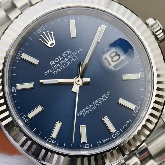 Rolex Datejust Swiss Replica watches are equipped with the new SuperLuminova™ Blue glow luminescent pigment that after sufficient activation by sunlight or artificial light will glow in the dark up to nine hours with uniform luminosity throughout.