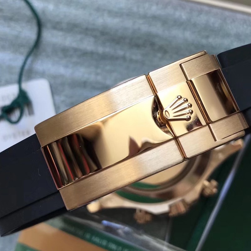 Rolex Cosmograph Daytona, 18k Yellow Gold 40mm watch, Reference 116518ln-0048. This model has Champagne/gold colored dial with black sub-dials. Applied black rimmed index hour markers with luminous fill. Polished 18k Yellow Gold hour and minute hands with black centerline and partial luminous fill. Fine printed minute/seconds and fractions of a second track on teh dial perimeter. Polished 18kt Yellow Gold screw-down crown with Rolex's patented "Triplock" triple waterproofness system, ensuring that the crown screws down against the Oyster case as securely as a submarine hatch. Screw-down chrono buttons in polished 18kt Yellow Gold. The dial closed by a Scratch-resistant Sapphire Crystal and solid 18kt Yellow Gold made case back. Chronograph/Stop watch function: large central seconds counter hand - accurate up to 1/8th of a second; 30-minute counter sub-dial located at the 3 o'clock position; 12-hour counter sub-dial located at the 9 o'clock position. Continuous running small seconds hand sub-dial located at the 6 o'clock position. The watch is equipped Black "Cerachrom" bezel, made of highly durable ceramic that is extremely hard, highly scratch-resistant, has excellent corrosion resistant properties and is unaffected by ultraviolet rays so the color will not fade. Yellow gold-filled engraved tachymeter scale on the bezel. The watch is mechanical chronograph; self-winding Manufacture Rolex 4130 contains 44 Jewels and has an approximate power reserve of 72 running the time only, or 66 hours with the chronograph function running. This model presented on Oysterflex strap of Flexible metal blades overmoulded with high-performance elastomer and a Folding Oysterlock safety clasp with Easylink 5 mm comfort extension link. The water resistance is up to 100m/330ft (10 ATM).