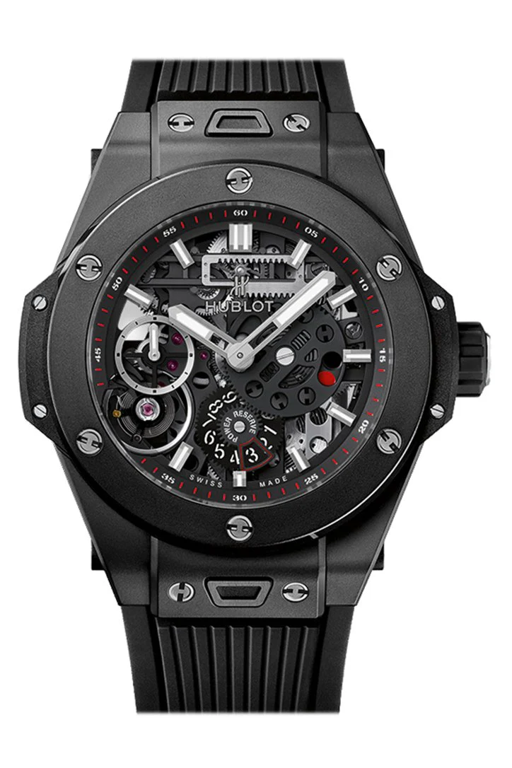 Hublot Big Bang Meca-10 45mm Mens Watch 414.CI.1123.RX 39mm Case Dimensions Stainless Steel Case Material Black Dial Color Scratch Resistant Sapphire Crystal Fixed Bezel 100m/330ft Water Resistance Transparent Case Back Rubber Band Material Black Color/Finish Push Button Deployant Buckle Clasp Automatic Movement