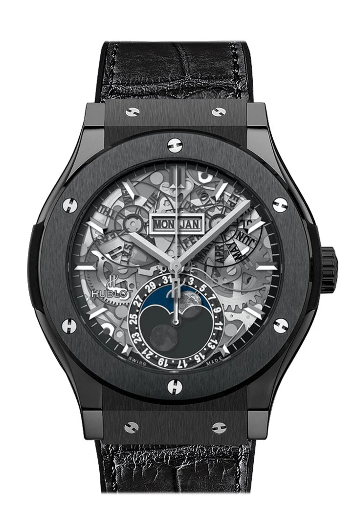 Black ceramic case with a black rubber strap with a black (alligator ) leather inlay. Fixed black ceramic bezel. Skeleton dial with luminous silver-tone hands and index hour markers. Minute markers around the outer rim. Dial Type: Analog. Day of the week and month display above the center dial. Date sub-dial at the 6 o'clock position. Hublot calibre HUB1131 automatic movement with a 42-hour power reserve. Scratch resistant sapphire crystal. Pull / push crown. Transparent case back. Case size: 45 mm. Round case shape. Deployment clasp with a push button release. Water resistant at 50 meters / 165 feet. Functions: month, date, day, hour, minute, second. Luxury watch style. Watch label: Swiss Made. Hublot Classic Fusion Skeleton Dial Automatic Mens Watch