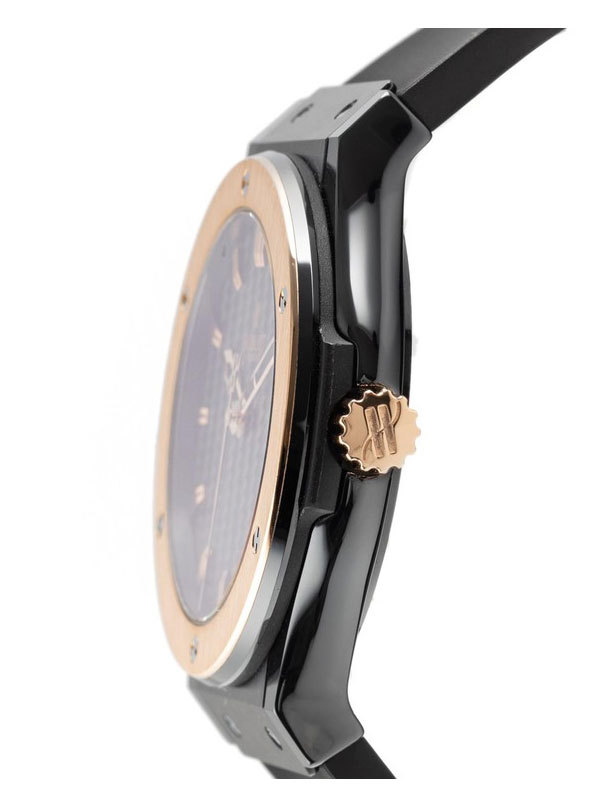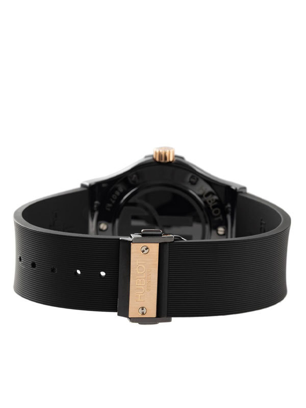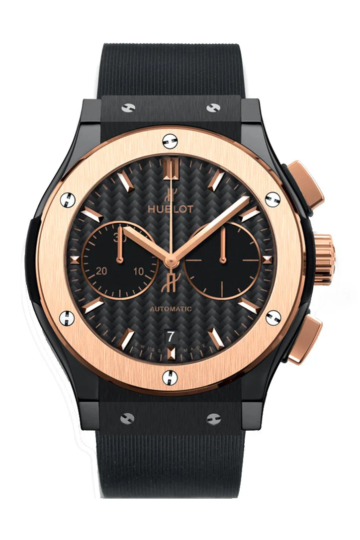 Ceramic and titanium case with a black leather strap. Fixed, 18k rose gold bezel. Black carbon fiber dial with rose gold-tone hands and index hour markers. Minute markers around the outer rim. Dial Type: Analog. Date display at the 6 o'clock position. Chronograph - sub-dials displaying: two - 60 second and 30 minute. Hublot Calibre HUB1143 automatic movement with about 42 hours of power reserve. Scratch resistant sapphire crystal. Pull / push crown. Transparent case back. Case size: 45 mm. Round case shape. Deployment clasp. Water resistant at 50 meters / 165 feet. Functions: chronograph, date, hour, minute, second. Luxury watch style. Watch label: Swiss Made. Hublot Classic Fusion Chronograph Automatic Mens Watch 521.CO.1781.LR