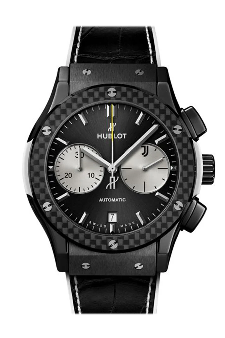 Polished and satin-finished black ceramic Diameter 45mm Height 13,05 mm Water Resistance 5 Bar Calibre HUB1143 Automatic, self-winding Power Reserve 42 h Movement Satin-finished black sunray Dial White rubber and black alligator strap with white stitching Strap
