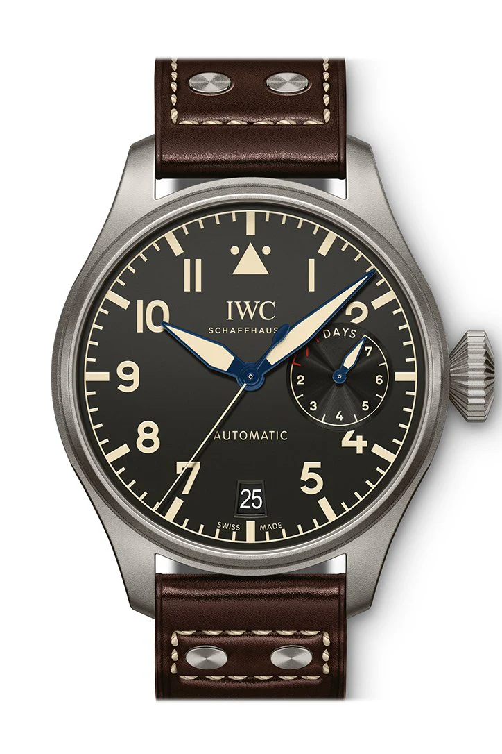 Titanium case with a brown (calfskin) leather strap. Fixed titanium bezel. Black dial with luminous blue hands and Arabic numeral hour markers. Minute markers around the outer rim. Dial Type: Analog. Luminescent hands and markers. Date display at the 6 o'clock position. Power reserve sub-dial. IWC calibre 52110 automatic movement with a 168-hour power reserve. Scratch resistant sapphire crystal. Screw down crown. Solid case back. Round case shape. Case size: 46.2 mm. Case thickness: 15.4 mm. Tang clasp. Water resistant at 60 meters / 200 feet. Functions: date, hour, minute, second, power reserve. Luxury watch style. Watch label: Swiss Made. IWC Big Pilots Automatic Black Dial Mens Watch