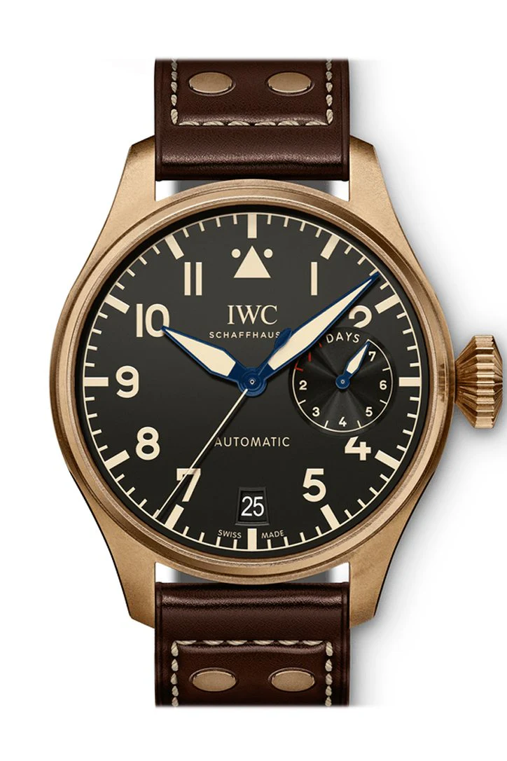 Bronze case Diameter 46.2 mm Height 15.4 mm Screw in crown Water resistance 6 bar 52110 Calibre IWC-manufactured movement Automatic, self-winding 168 hours Power Reserve Frequency 28800.0 vph (4.0 hz) 257 Components 31 Jewels Côtes de Genève, perlage Soft-iron inner case for protection against magnetic fields 7 days power reserve Power reserve display Date display Glass secured against displacement by drop in air pressure Sapphire glass, convex, antireflective coating on both sides Pellaton automatic winding Central hacking seconds Limited to 1500 pieces Black dial with luminescence Brown calfskin strap Strap width 22 mm