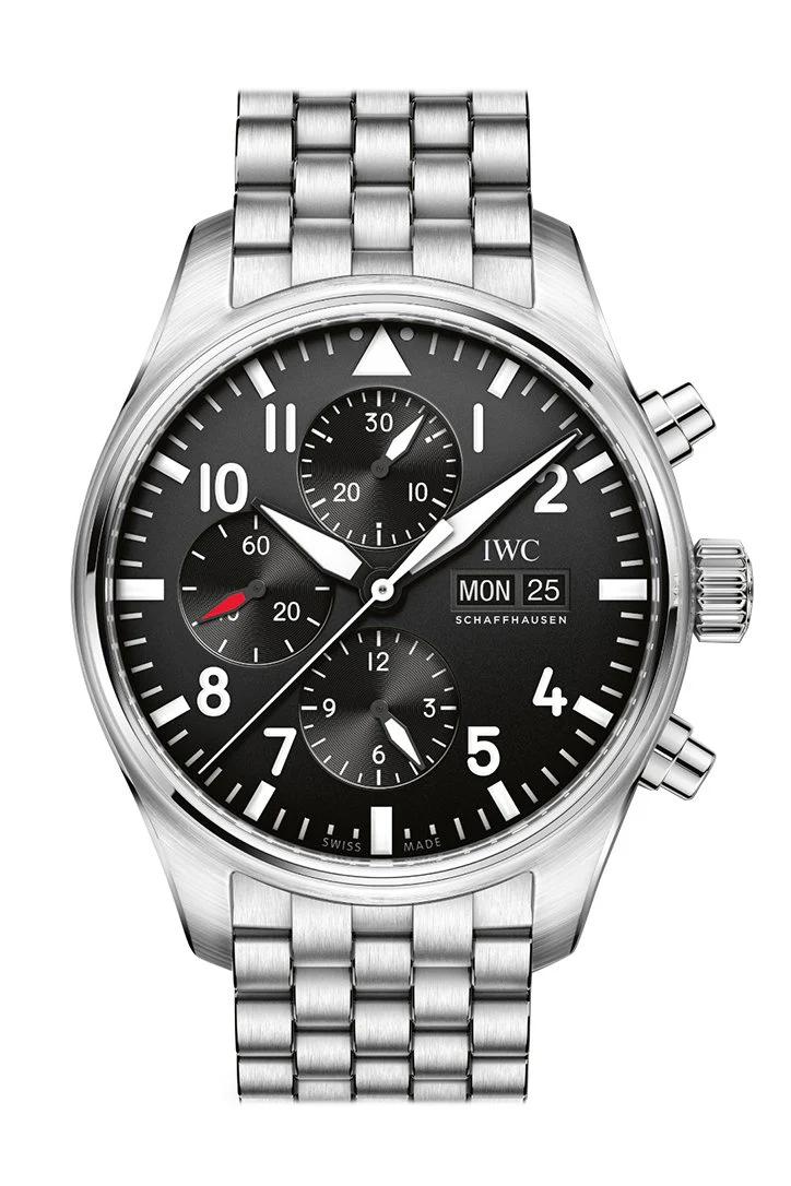 Stainless steel case with a stainless steel bracelet. Fixed stainless steel bezel. Black dial with black hands and Arabic numeral hour markers. Minute markers around the outer rim. Dial Type: Analog. Luminescent hands and markers. Day of the week and date display at the 3 o'clock position. Chronograph - three sub-dials displaying: 60 seconds, 30 minute, and 12 hours. IWC calibre 79320 automatic movement with a 44-hour power reserve. Scratch resistant sapphire crystal. Screw down crown. Solid case back. Case size: 43 mm. Case thickness: 15 mm. Round case shape. Bracelet width: 20 mm. Fold over clasp with a safety release. Water resistant at 60 meters / 200 feet. Functions: chronograph, date, day of the week, hour, minute, second. Luxury watch style. Watch label: Swiss Made. IWC Pilot Automatic Chronograph Black Dial Mens Watch