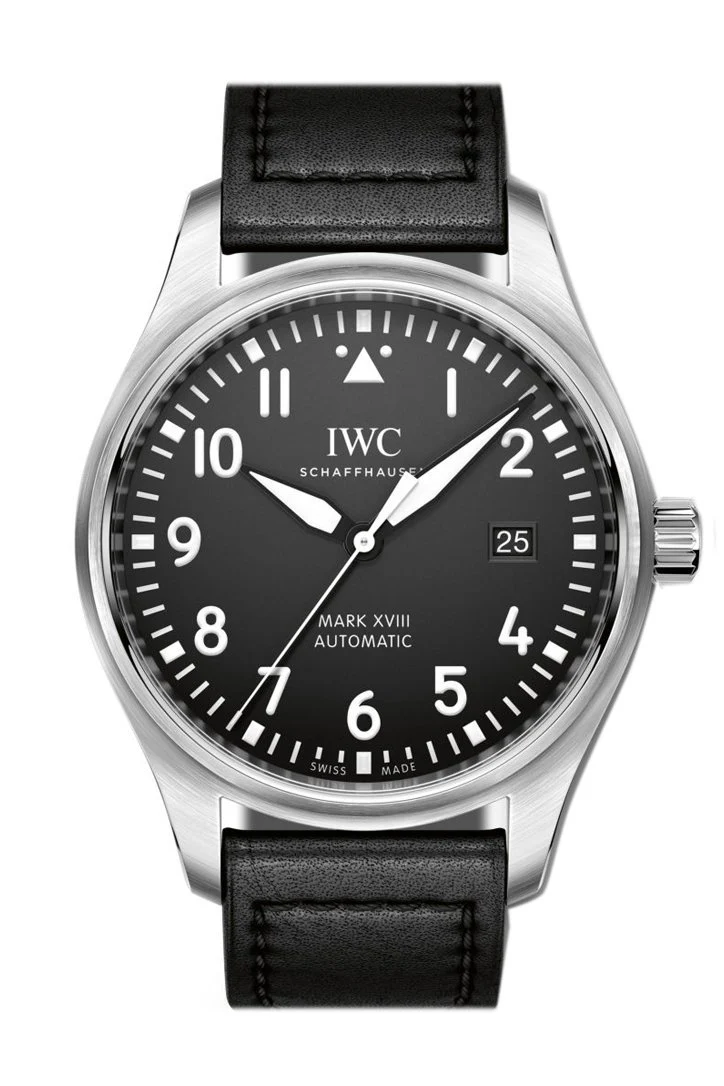 Stainless steel case with a black santoni calfskin leather strap (red backed). Fixed stainless steel bezel. Black dial with black hands and Arabic numeral hour markers. Minute markers around the outer rim. Dial Type: Analog. Luminescent hands and markers. Date display at the 3 o'clock position. IWC calibre 30110 automatic movement with a 42-hour power reserve. Scratch resistant sapphire crystal. Screw down crown. Solid case back. Case size: 40 mm. Case thickness: 11 mm. Round case shape. Tang clasp. Water resistant at 60 meters / 200 feet. Functions: date, hour, minute, second. Luxury watch style. Watch label: Swiss Made. IWC Pilots Mark XVIII Automatic Black Dial Mens Watch IW327001