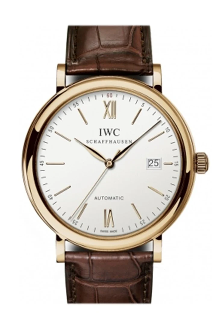 18kt rose gold case with a brown crocodile leather strap. Fixed 18kt rose gold bezel. Silver dial with gold-tone hands and index hour markers. Roman numerals mark the 6 and 12 o'clock positions. Minute markers around the outer rim. Dial Type: Analog. Date display appears at the 3 o'clock position. Automatic movement with a 42-hour power reserve. Scratch resistant sapphire crystal. Pull / push crown. Solid case back. Case diameter: 40 mm. Case thickness: 9.5 mm. Round case shape. Band width: 20 mm. Tang clasp. Water resistant at 30 meters/ 100 feet. Functions: hours, minutes, seconds, date. Dress watch style. Watch label: Swiss Made. IWC Portofino Silver Dial 18kt Rose Gold Case Brown Leather Strap Automatic Mens Watch
