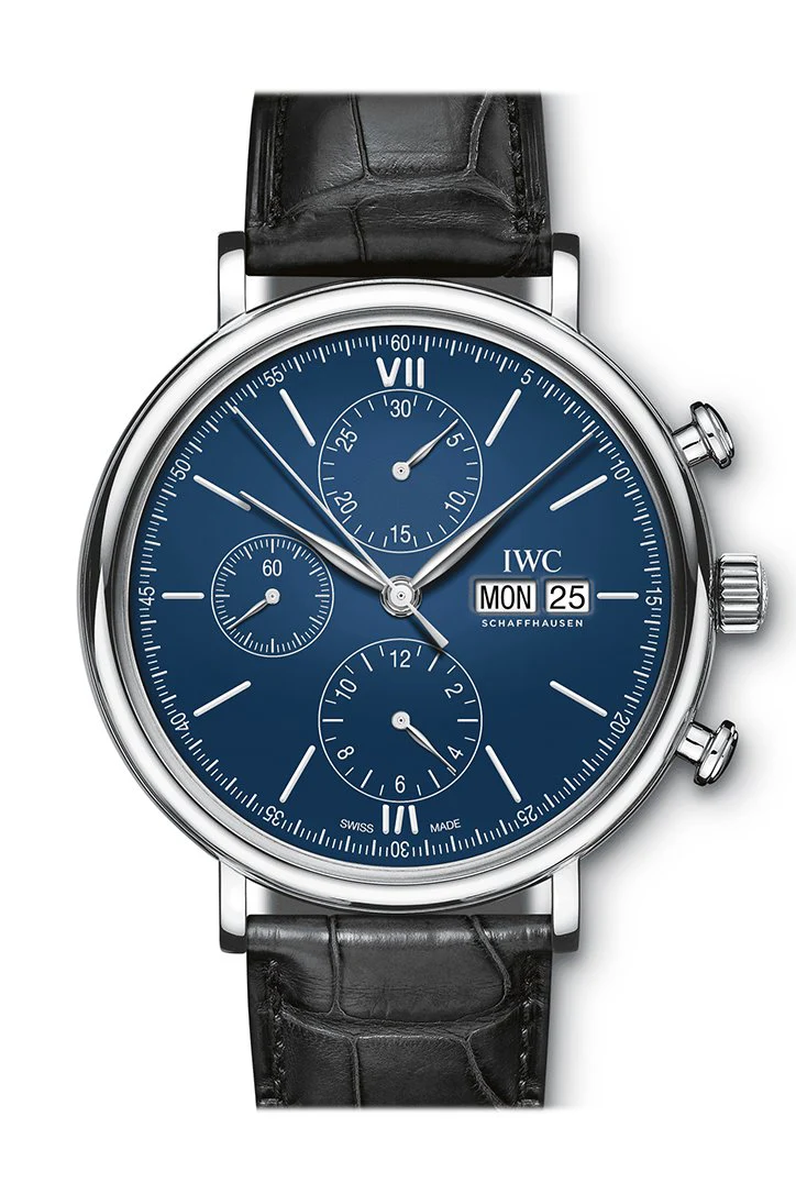 Stainless steel case with a black (alligator) leather strap. Fixed stainless steel bezel. Blue dial with luminous silver-tone hands and index hour markers. Roman numerals mark the 6 and 12 o'clock positions. Minute markers around the outer rim. Dial Type: Analog. Luminescent hands and markers. Day of the week and date display at the 3 o'clock position. IWC calibre 79320 automatic movement with a 44-hour power reserve. Scratch resistant sapphire crystal. Solid case back. Round case shape. Case size: 42 mm. Case thickness: 13.6 mm. Band width: 20 mm. Tang clasp. Water resistant at 30 meters / 100 feet. Functions: chronograph, date, day of the week, hour, minute, second. Additional Info: limited to 2000 pieces. Luxury watch style. Watch label: Swiss Made. IWC Portofino Chronograph Edition "150 Years" Automatic Mens Chonograph Watch