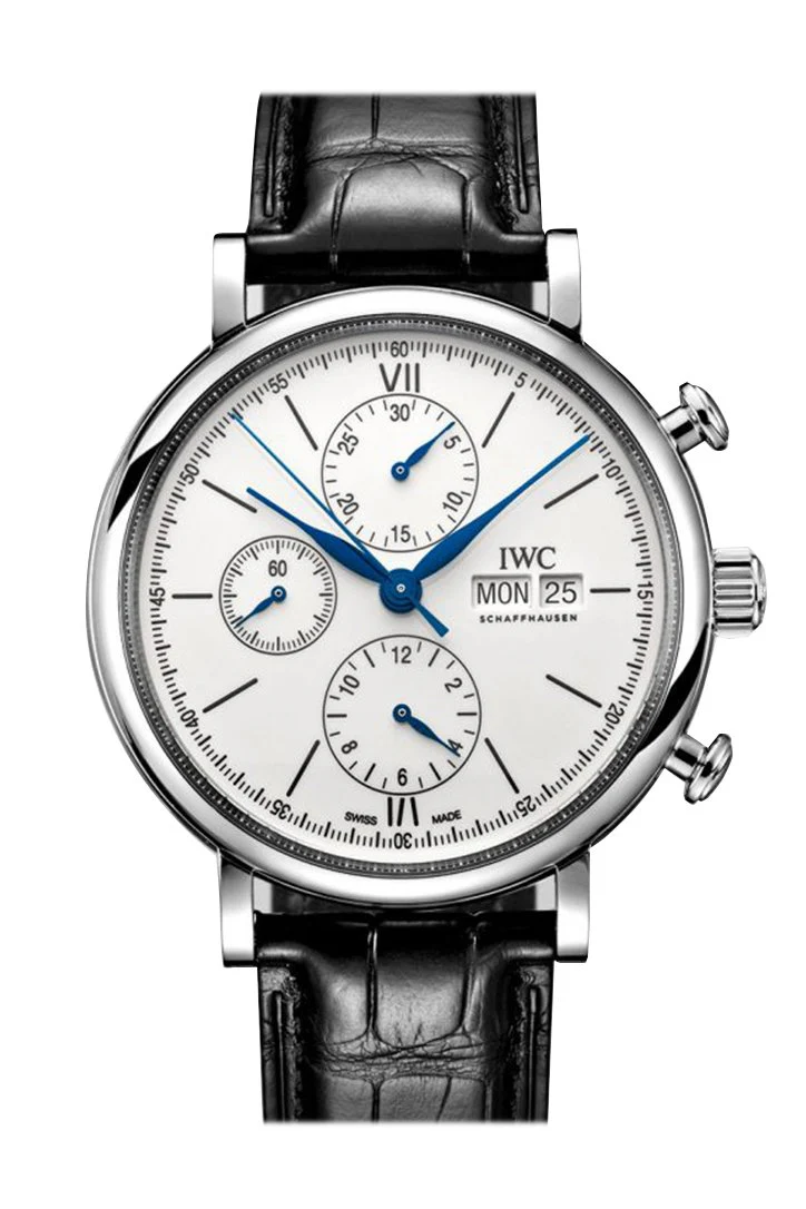 Stainless steel case with a crocodile leather strap. Fixed stainless steel bezel. Index hour markers. Roman numerals mark the 6 and 12 o'clock positions. minute markers around the outer rim. Dial Type: Analog. Day of the week and date display at the 3 o'clock position. Chronograph - sub-dials displaying: three - 60 second, 30 minute and 12 hour. IWC Calibre 79320 automatic movement with a 44-hour power reserve. Scratch resistant sapphire crystal. Pull / push crown. Solid case back. Round case shape, case size: 42 mm, case thickness: 13.5 mm. Band width: 20 mm. Tang clasp. Water resistant at 30 meters / 100 feet. Functions: chronograph, date, day, hour, minute, second. Luxury watch style