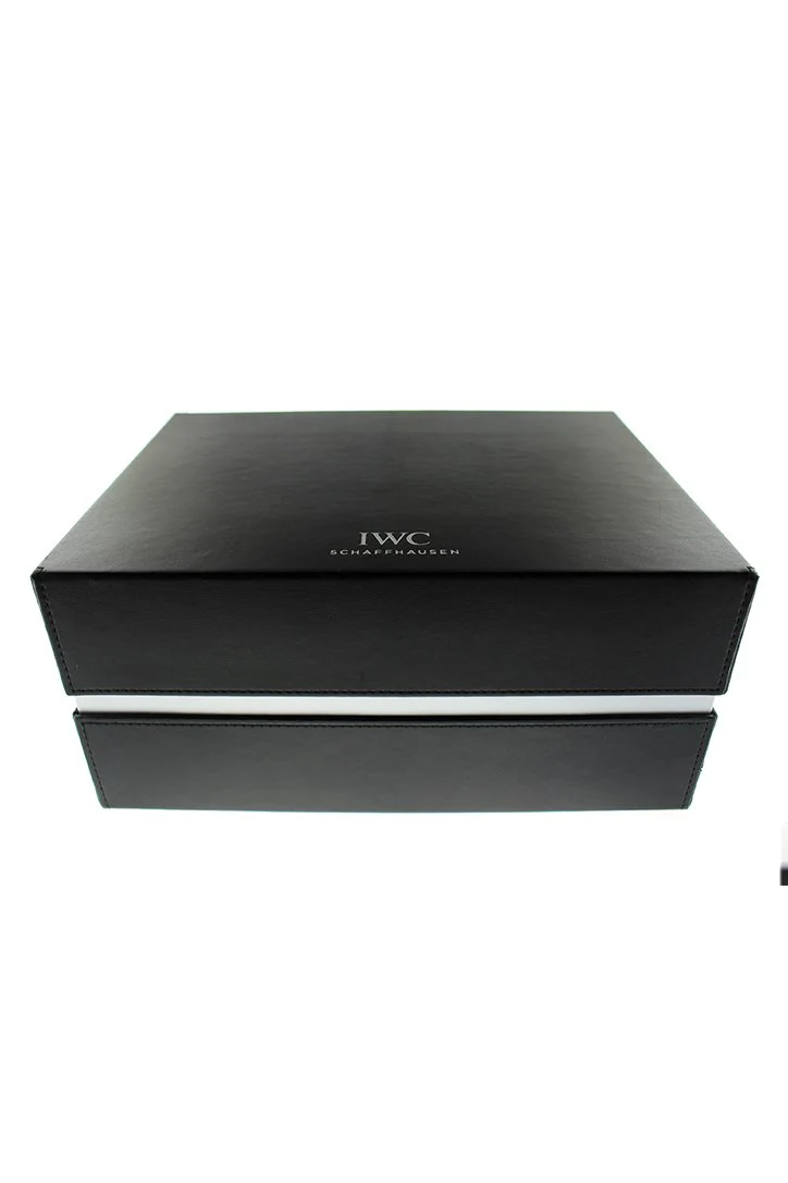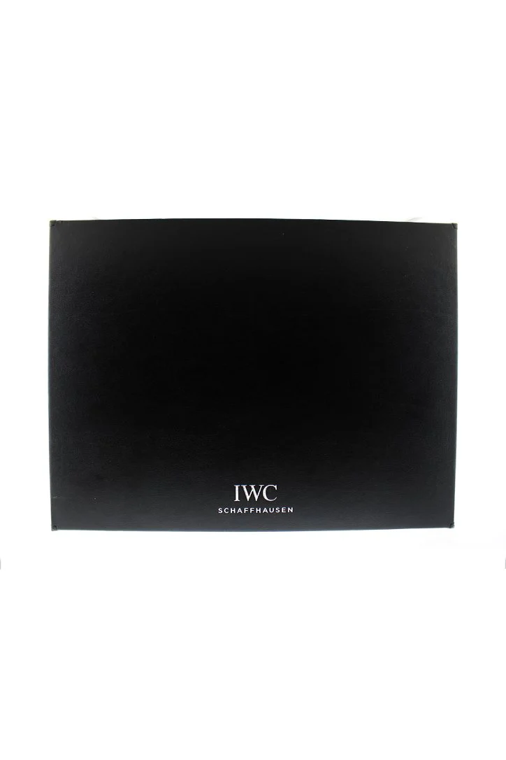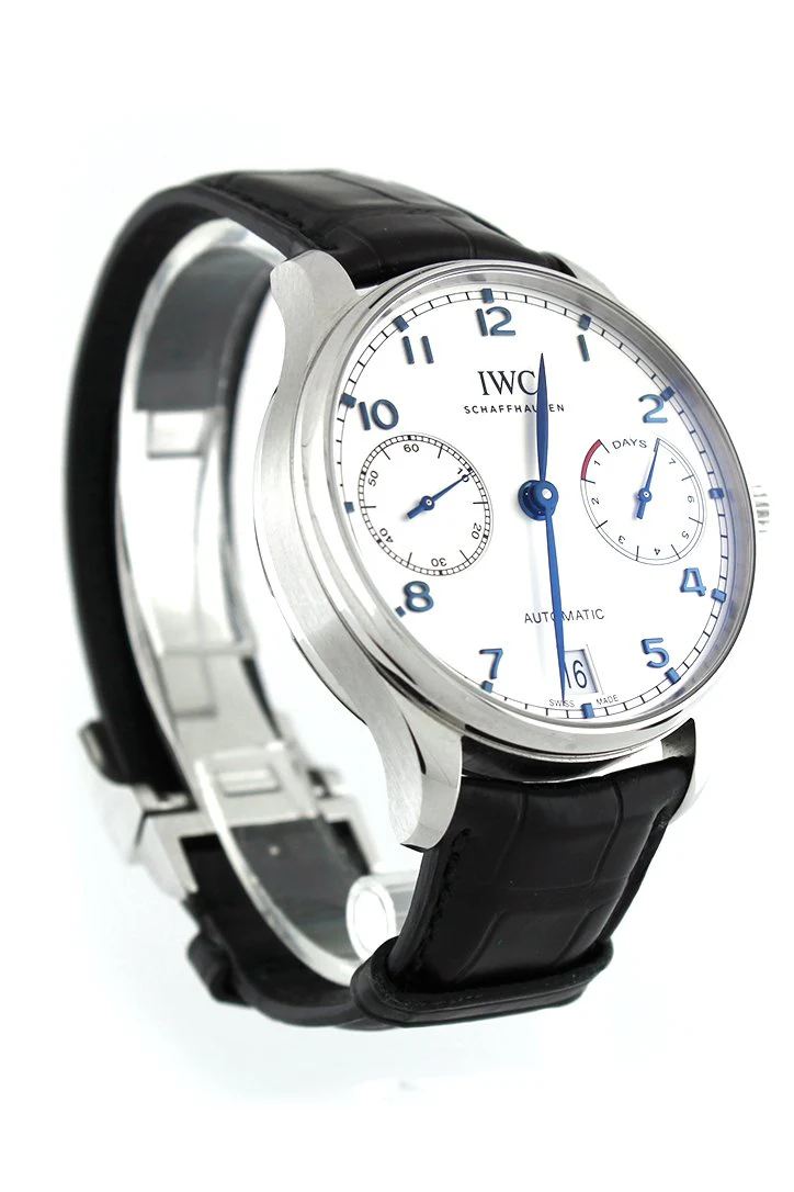 Stainless steel case with a black alligator leather strap. Fixed stainless steel bezel. Silver dial with blue hands and Arabic numeral hour markers. Minute markers around the outer rim. Dial Type: Analog. Date display at the 6 o'clock position. Two sub-dials displaying: 7 day power reserve and 60 second. Automatic movement with a 168-hour power reserve. Scratch resistant sapphire crystal. Push / pull crown. Skeleton case back. Case diameter: 42.3 mm. Case thickness: 14.5 mm. Round case shape. Fold over clasp with safety release. Water resistant at 30 meters / 100 feet. Functions: date, hour, minute, second. Luxury watch style. Watch label: Swiss Made. IWC Portugieser Automatic Black Strap Mens Watch