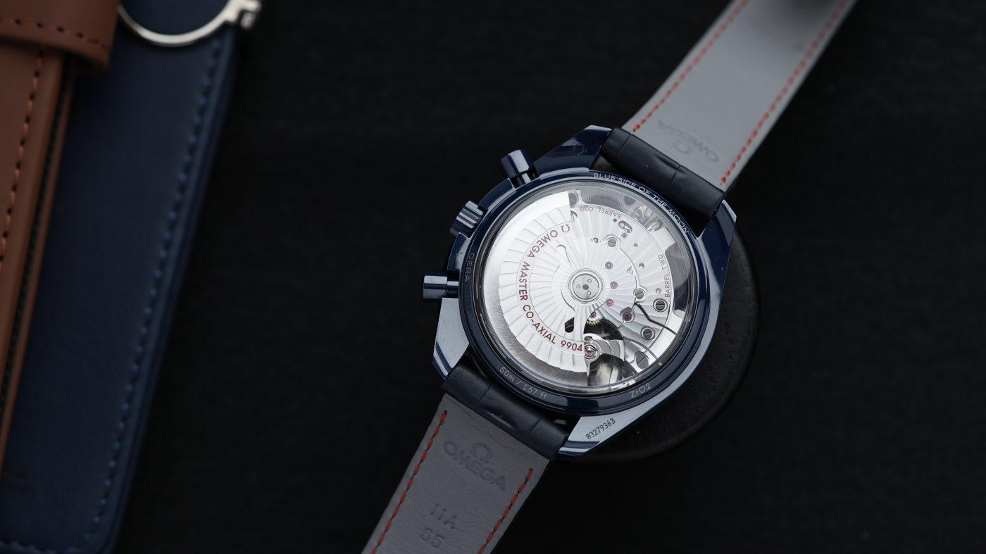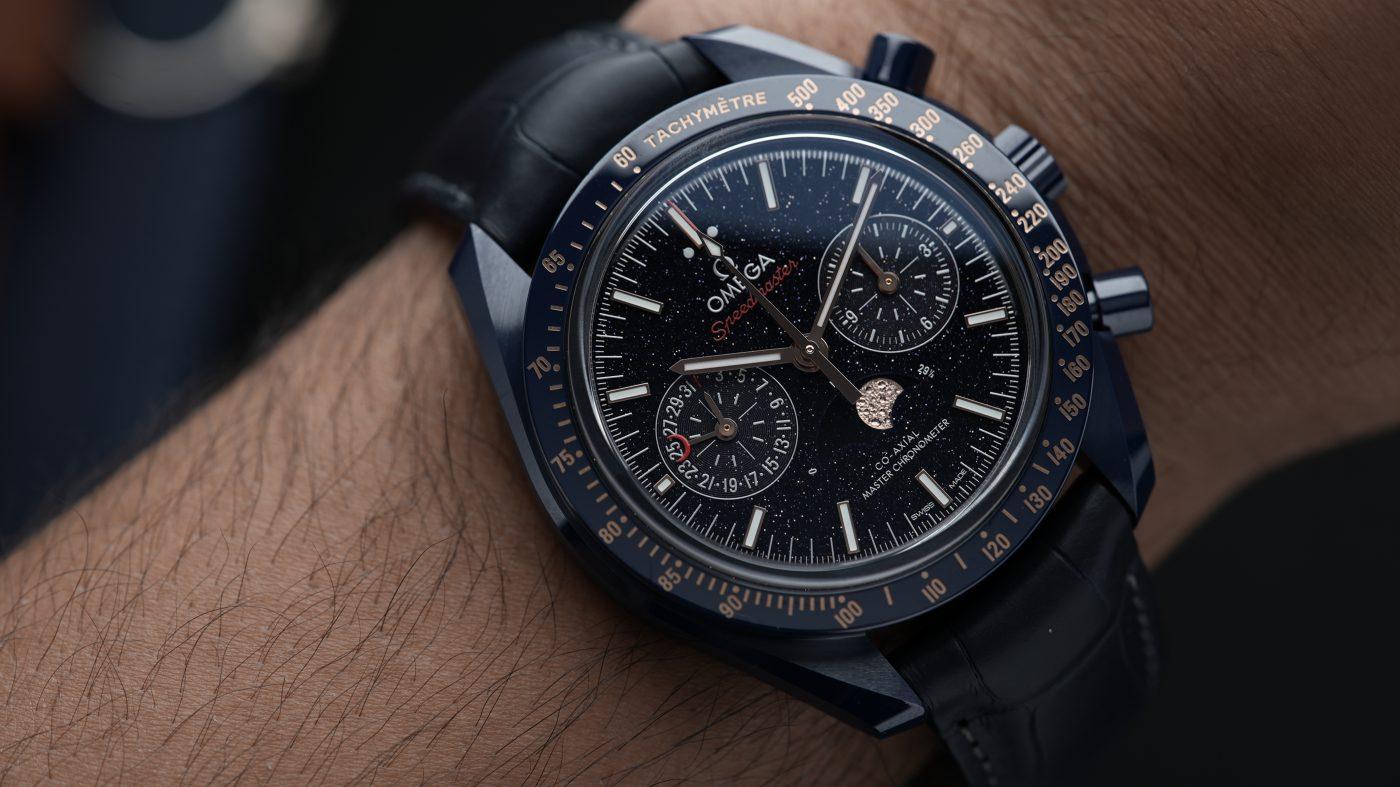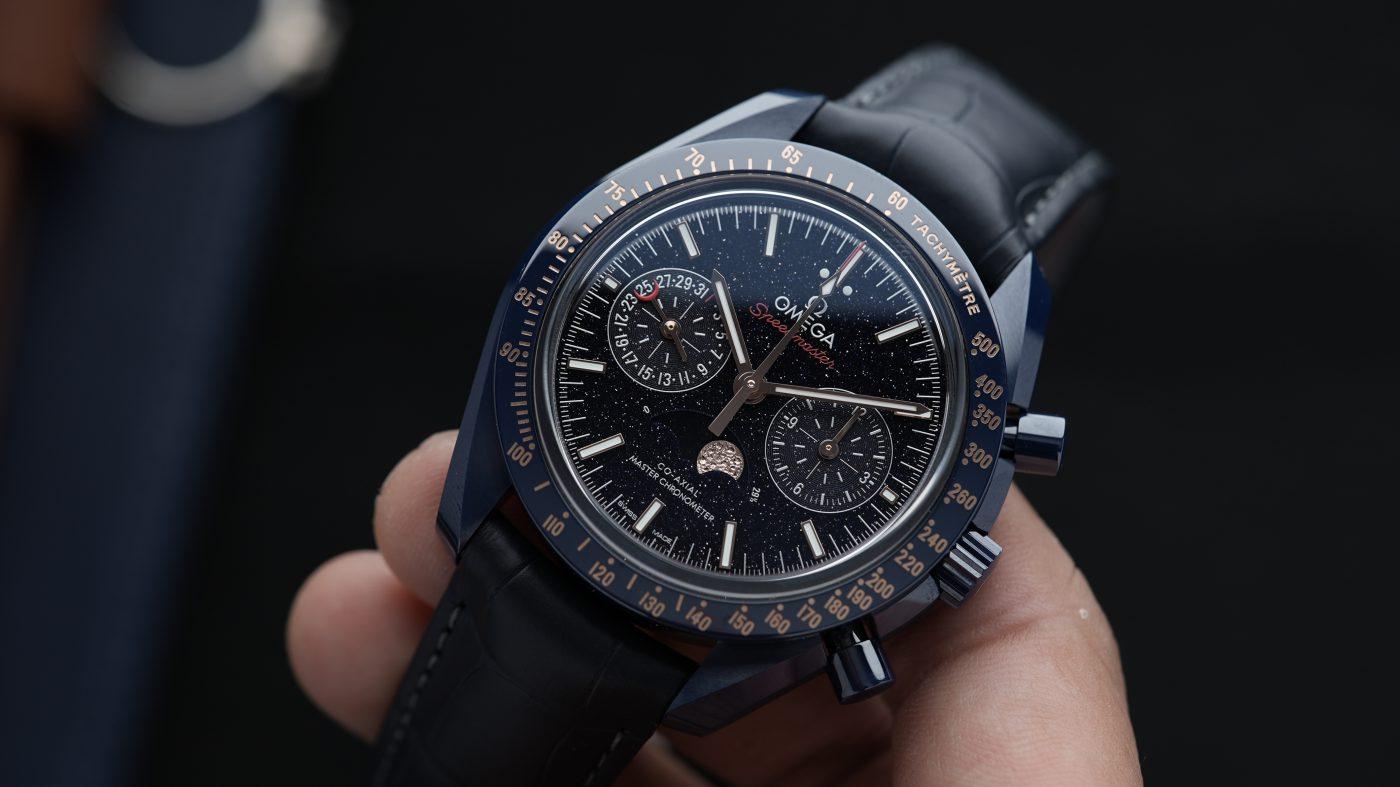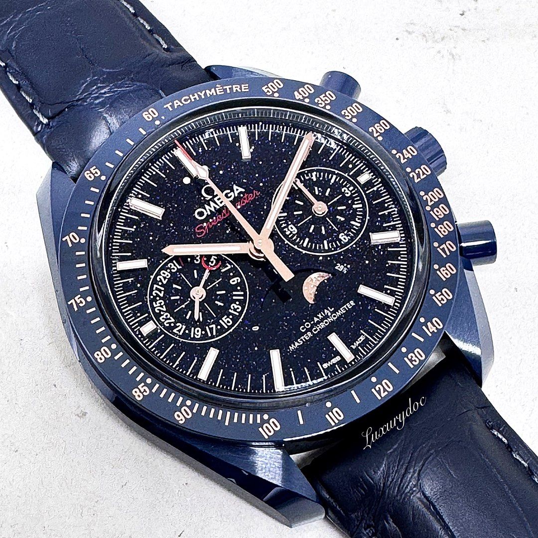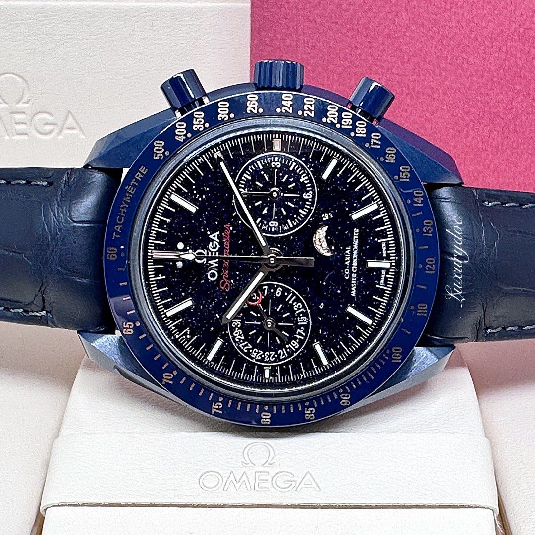 FS.BNIB OMEGA SPEEDMASTER MOONPHASE AUTOMATIC BLUE SIDE OF THE MOON AVENTURINE DIAL 44.25MM WATCH 304.93.44.52.03.002 Retail Price : $21,850 Technical Specifications Reference 304.93.44.52.03.002 Between lugs 21 mm Lug‑to‑lug 49.8 mm Thickness 17.1 mm Case diameter 44.25 mm Case Blue ceramic Dial colour Blue Crystal Scratch‑resistant sapphire crystal with anti‑reflective treatment on both sides Water resistance 5 bar (50 metres / 167 feet) Total product weight (approx.) 106 g Calibre Omega 9904 Movement Type Self winding Power reserve 60 hours STRAP Strap color Blue Strap type Leather strap Strap surface Alligator leather Buckle type Foldover clasp Buckle material Ceramic Watch is brand new and genuine. Watch comes with its complete set. Trade ins of selected models of ROLEX, HUBLOT, AP, OMEGA, IWC, TUDOR, JLC, CARTIER , ZENITH , TAG HEUER and PANERAI are welcome