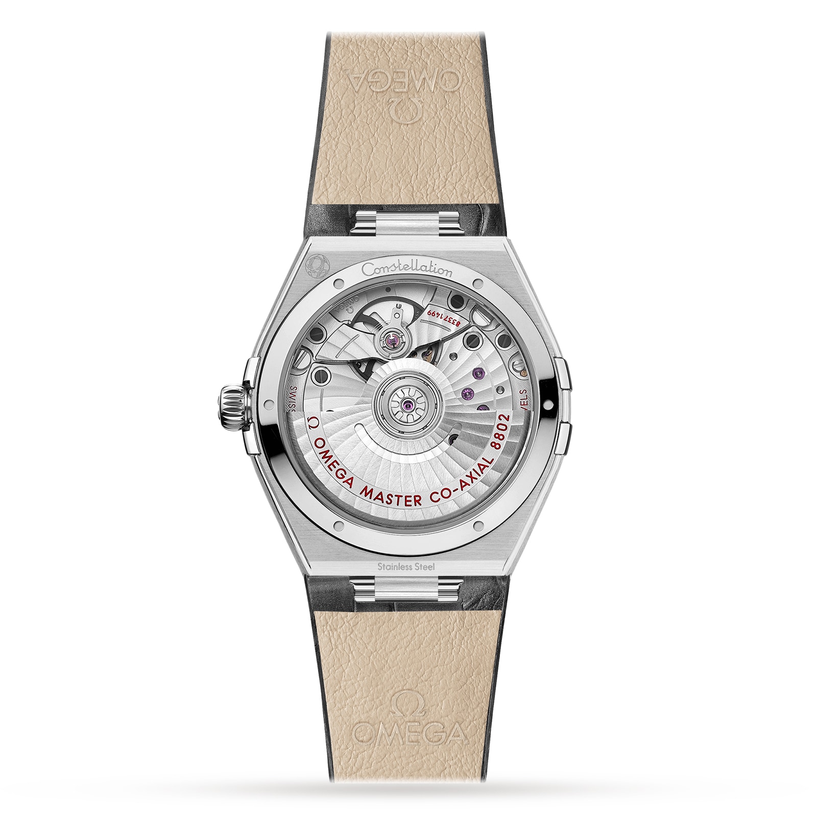 Presented on a grey leather strap, the timepiece is driven by the OMEGA Co-Axial Master Chronometer Calibre 8802, visible through the domed scratch-resistant sapphire crystal.
