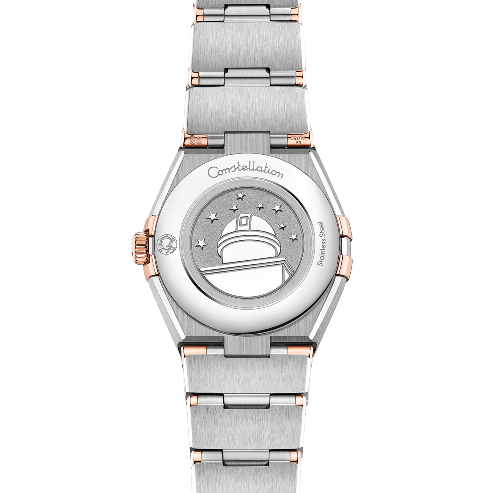 This 25 mm 18K Sedna™ gold and stainless steel model features a bezel engraved with Roman numerals, crystal white silvery dial with diamond hour markers and scratch-resistant saphire crystal. The hands, OMEGA logo, Constellation star and diamond holders are also in 18K Sedna™ gold.