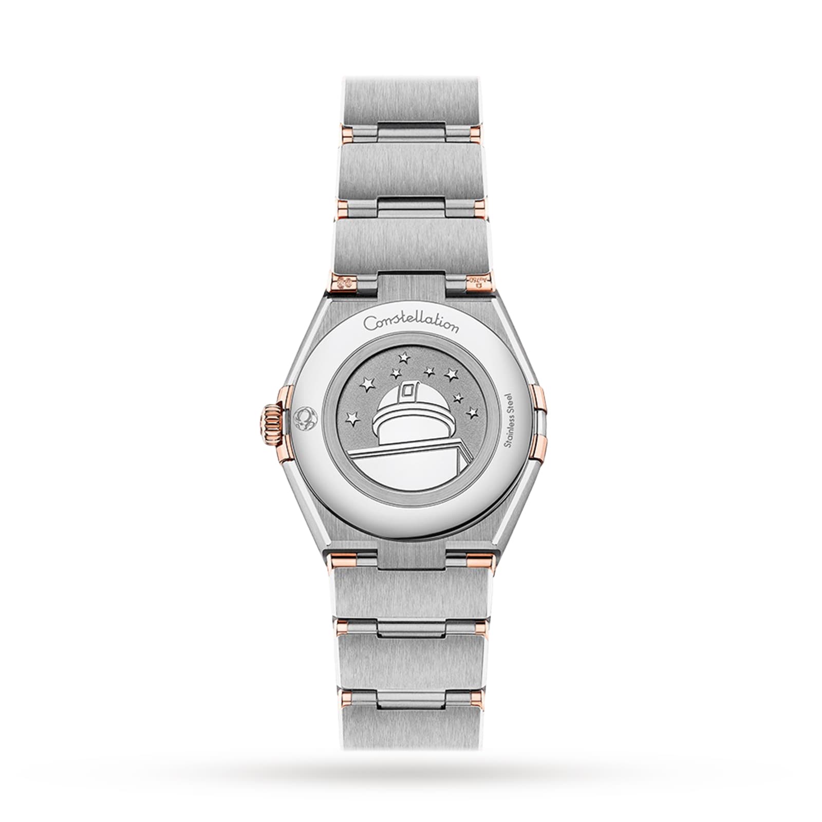 This 28 mm 18K Sedna™ gold and stainless steel model features a diamond-paved bezel, sun-brushed brown dial dial with diamond hour markers and scratch-resistant sapphire crystal. The hands, OMEGA logo, Constellation star and diamond holders are also in 18K Sedna™ gold.