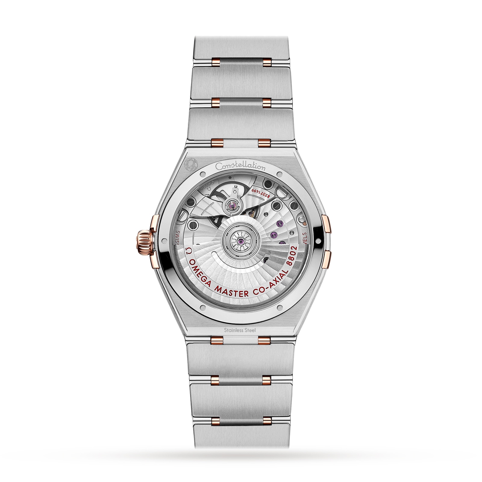 Presented on the iconic mono-rang bracelet with a butterfly clasp and easy comfort adjustment, the timepiece is driven by the OMEGA Co-Axial Master Chronometer Calibre 8802, visible through the domed scratch-resistant sapphire crystal.