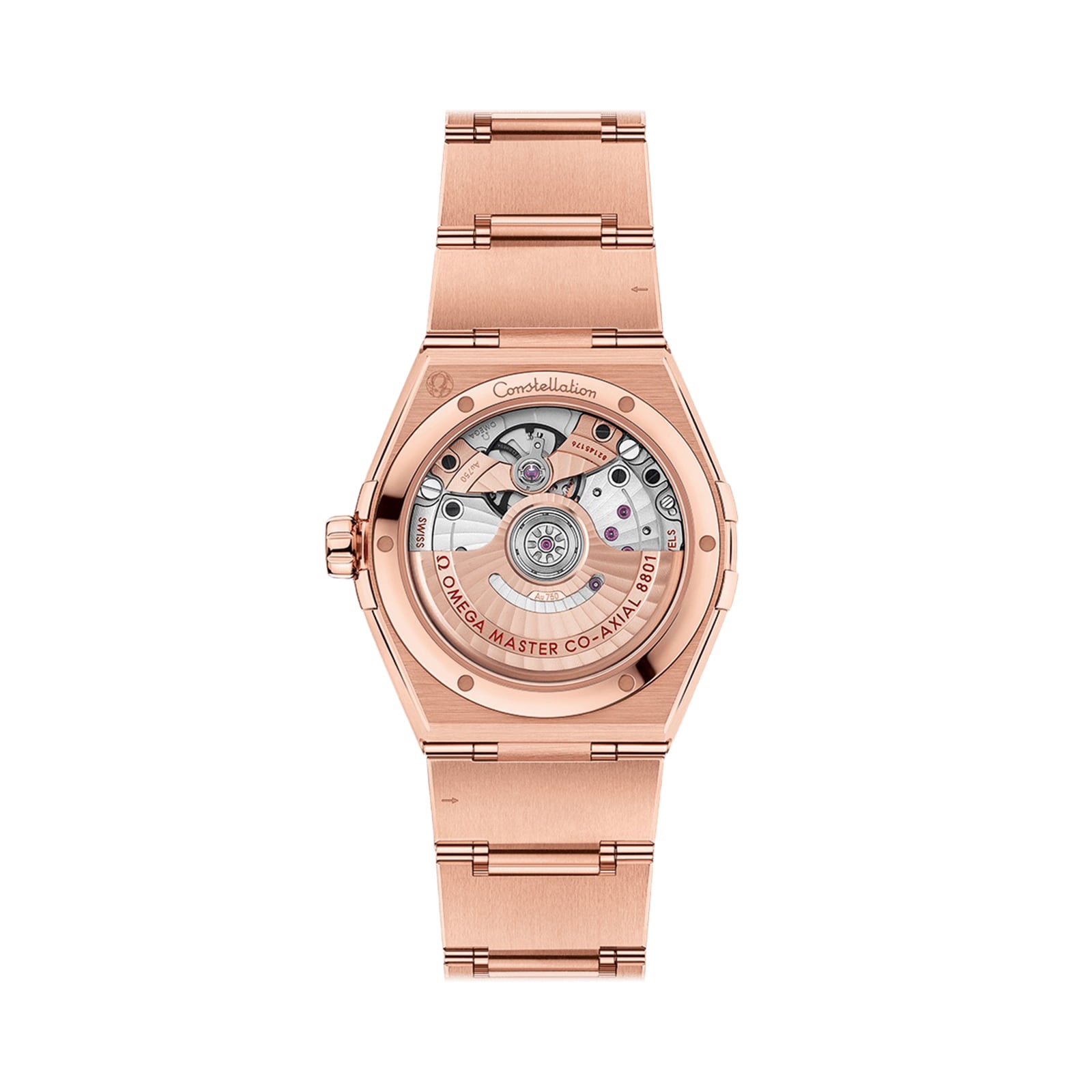 At the heart of this timepiece is the OMEGA Co-Axial Master Chronometer Calibre 8801, visible through the domed scratch-resistant sapphire crystal.