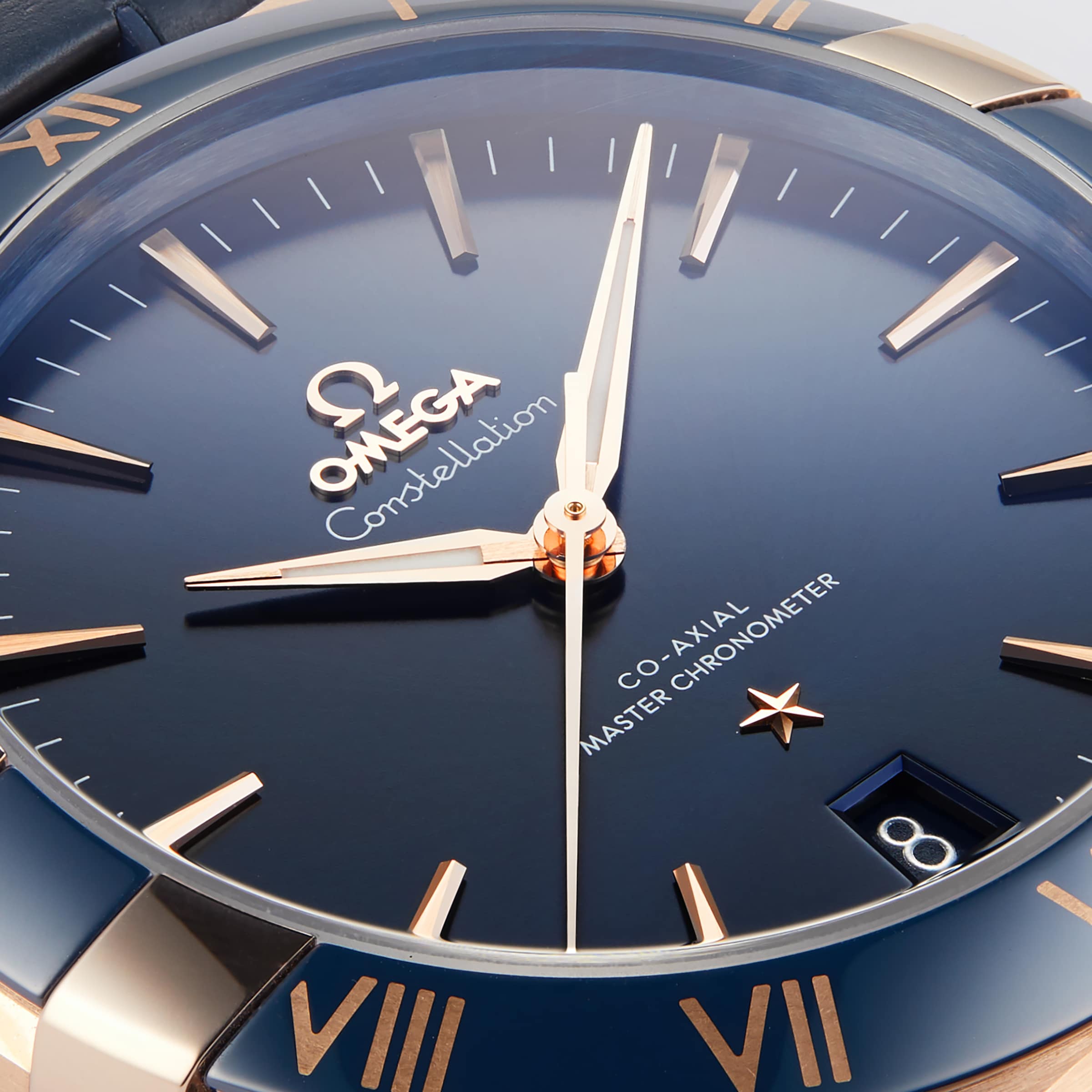 This 41mm timepiece features an 18K Sedna™gold case, paired with a deep blue, rubber-lined leather strap. The sun-brushed blue dial is framed by a polished, blue ceramic bezel with Ceragold™ Roman numerals.