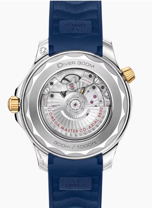 The Master Chronometer 8800 Omega calibre movement powers this timepiece, visible at work through the sapphire crystal caseback.