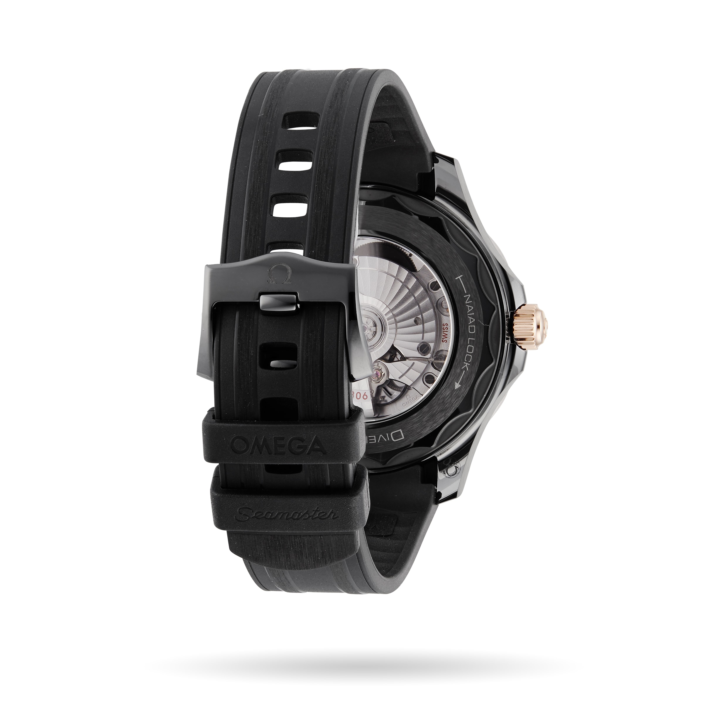The watch is paired with an integrated, textured, black rubber strap with black ceramic buckle and is powered by OMEGA’s Co-Axial Master Chronometer Calibre 8806 movement, officially certified by METAS to withstand magnetic fields up to 15,000 gauss. The black ceramic wave-edged caseback houses a sapphire crystal for a clear view of this incredible movement.