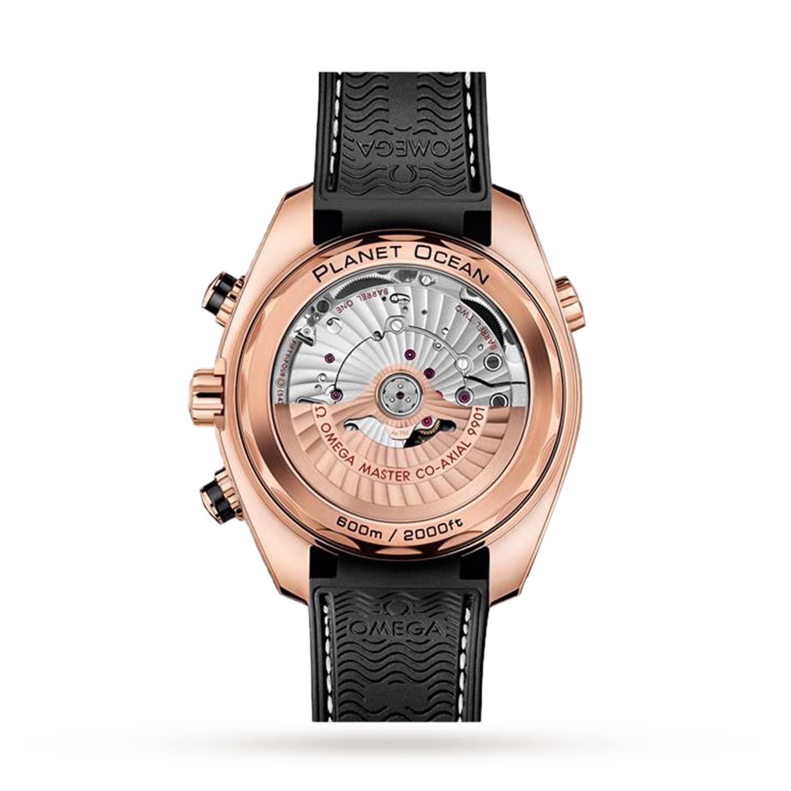The OMEGA Seamaster Planet Ocean 600M Master Chronometer Chronograph is water resistant to 60 bar (600 metres / 2000 feet), and has a helium-escape valve. The OMEGA Master Chronometer calibre 9901 at the heart of this timepiece can be seen through the transparent caseback. To achieve Master Chronometer status, it has passed the 8 rigorous tests set by METAS (The Swiss Federal Institute of Metrology).
