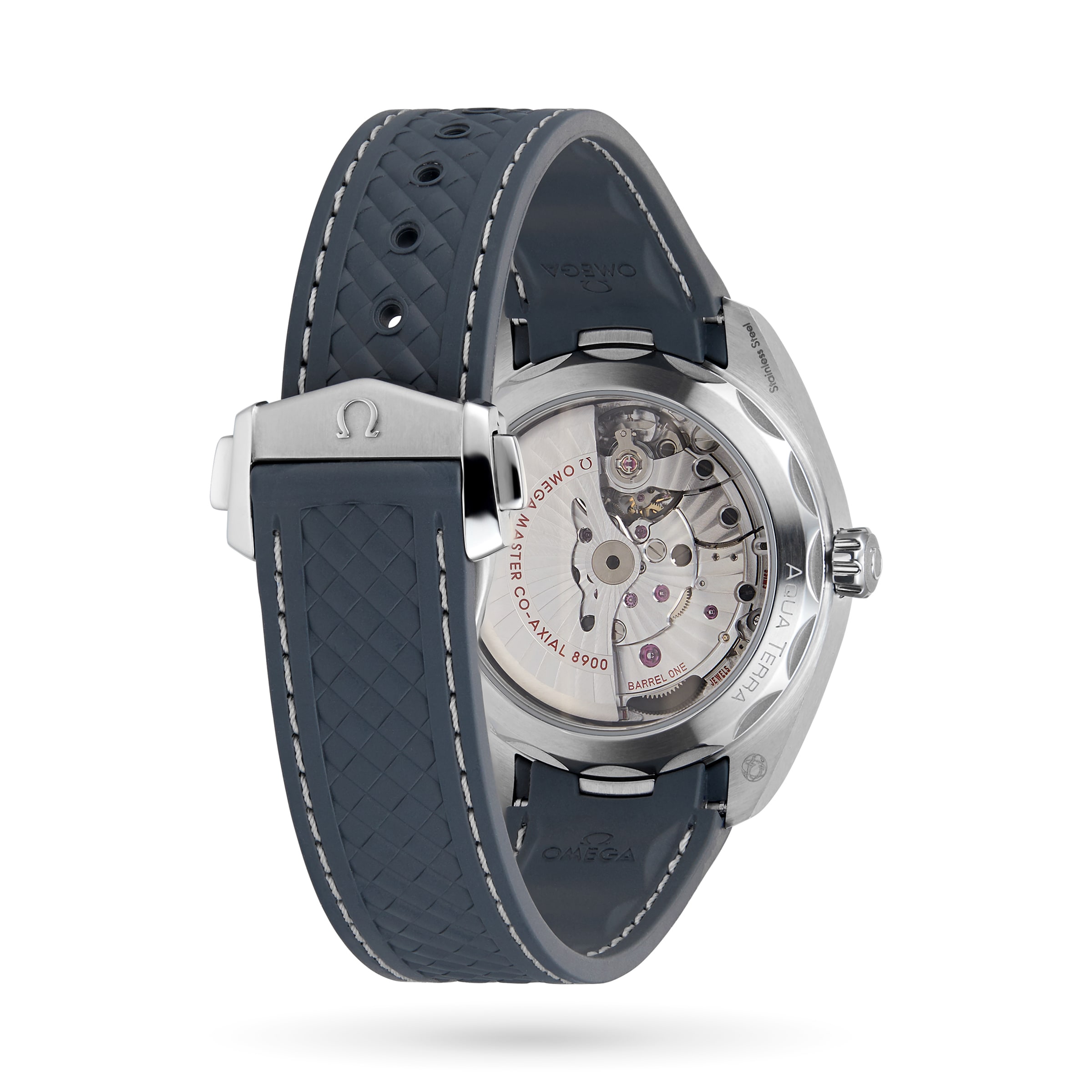 The blue, teak pattern dial features a date window at 6 o’clock, replicating the first Omega watch with a date window, released in 1952. Vivid blue accents appear on the central seconds hand and the four quarter numbers on the minute track, while the maritime influence can be seen in the wave-edged design on the caseback.