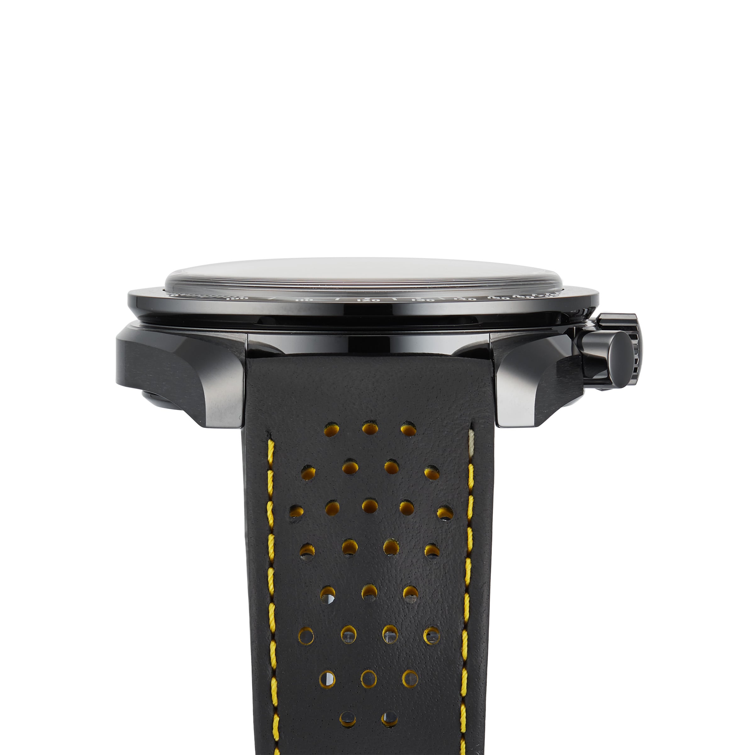 This 44.25mm timepiece features a perforated black leather strap with a yellow rubber interior, paired with a sleek black ceramic case and a tachymeter scale filled with white Super-LumiNova.