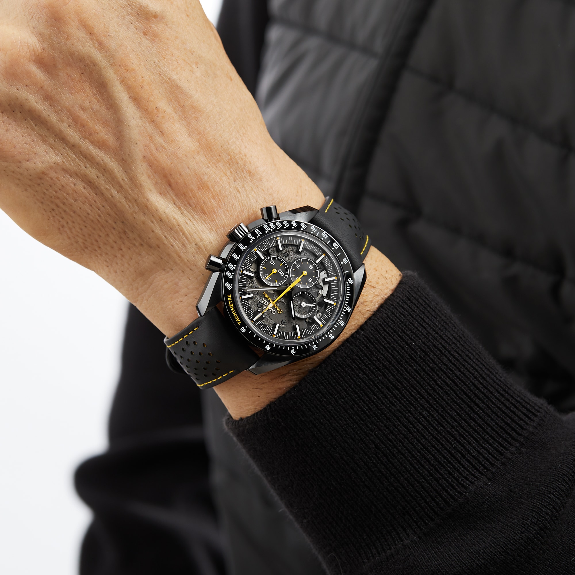 Powering the watch is a remarkable, blackened version of the iconic Moonwatch 1861 calibre, specially decorated using laser ablation to create realistic imagery of the moon’s surface.