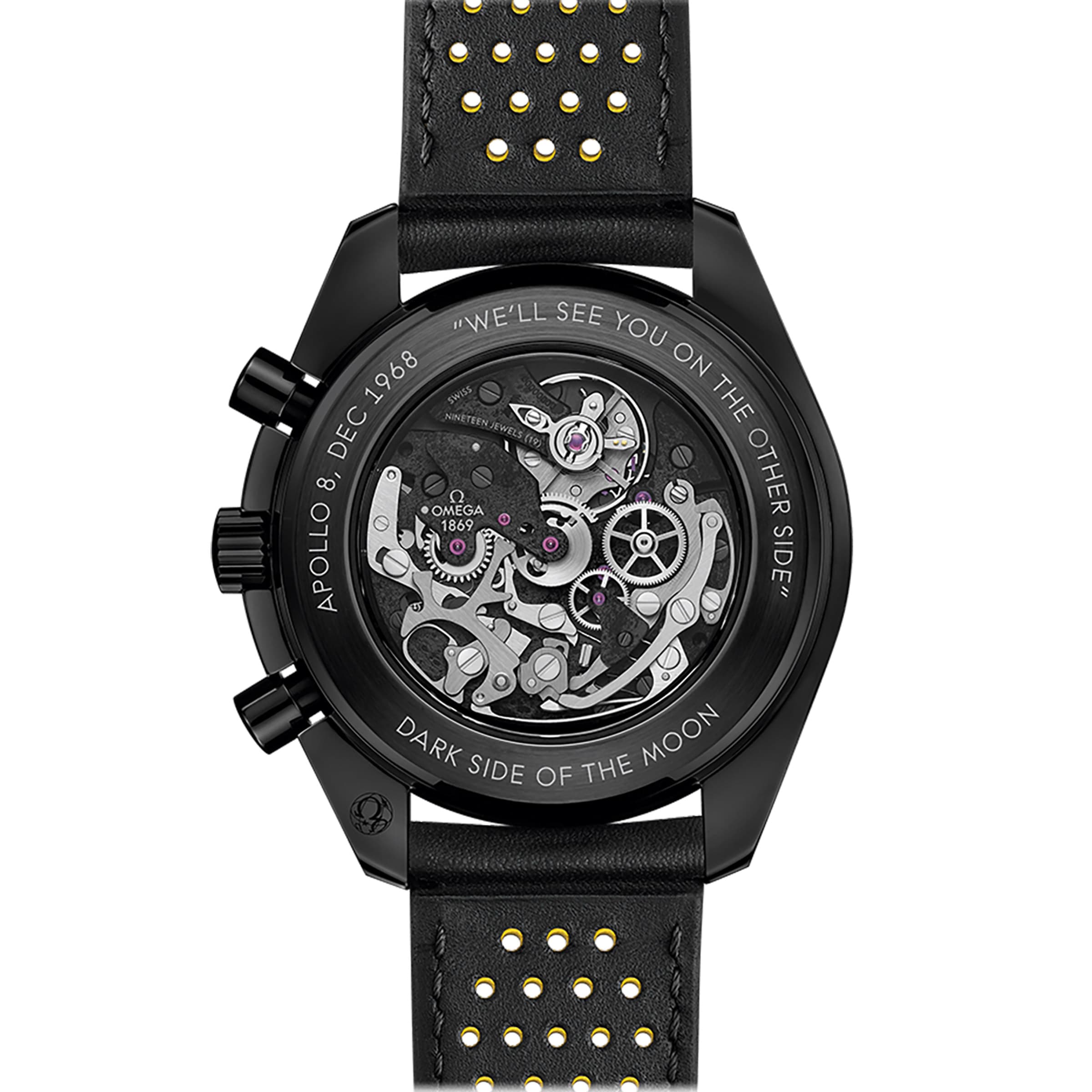 The black ceramic skeletonised dial represents the crater-filled lunar surface as seen from earth, while the caseback reveals the dark side of the moon only seen by astronauts.