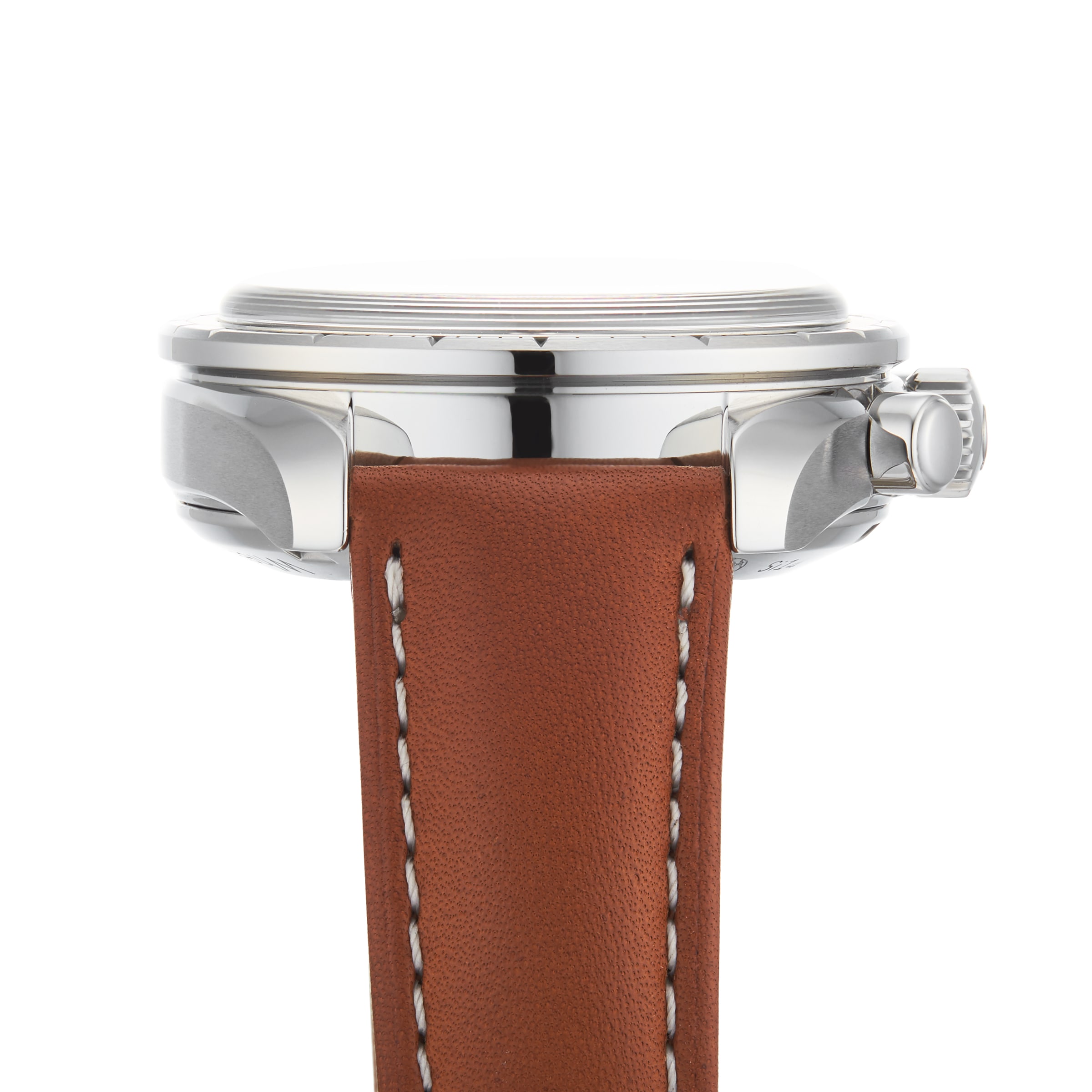 Presented on a brown leather strap is a 38mm stainless steel case with a bezel featuring a tachymeter scale on a grey aluminium ring.