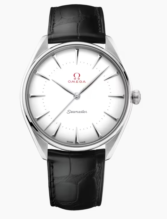 This 39.5 mm model has an 18K Canopus™ gold case and a black, leather strap. The domed dial is light, eggshell white enamel with a distinctive vintage OMEGA logo, minute track and Seamaster wording also in enamel. The “leaf” hands and applied indexes are 18K white gold.