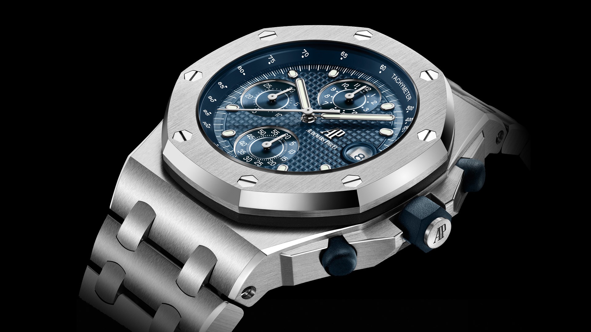 Blue dial with “Petite Tapisserie” pattern, blue counters, white gold applied hour-markers and Royal Oak hands with luminescent coating, blue inner bezel.