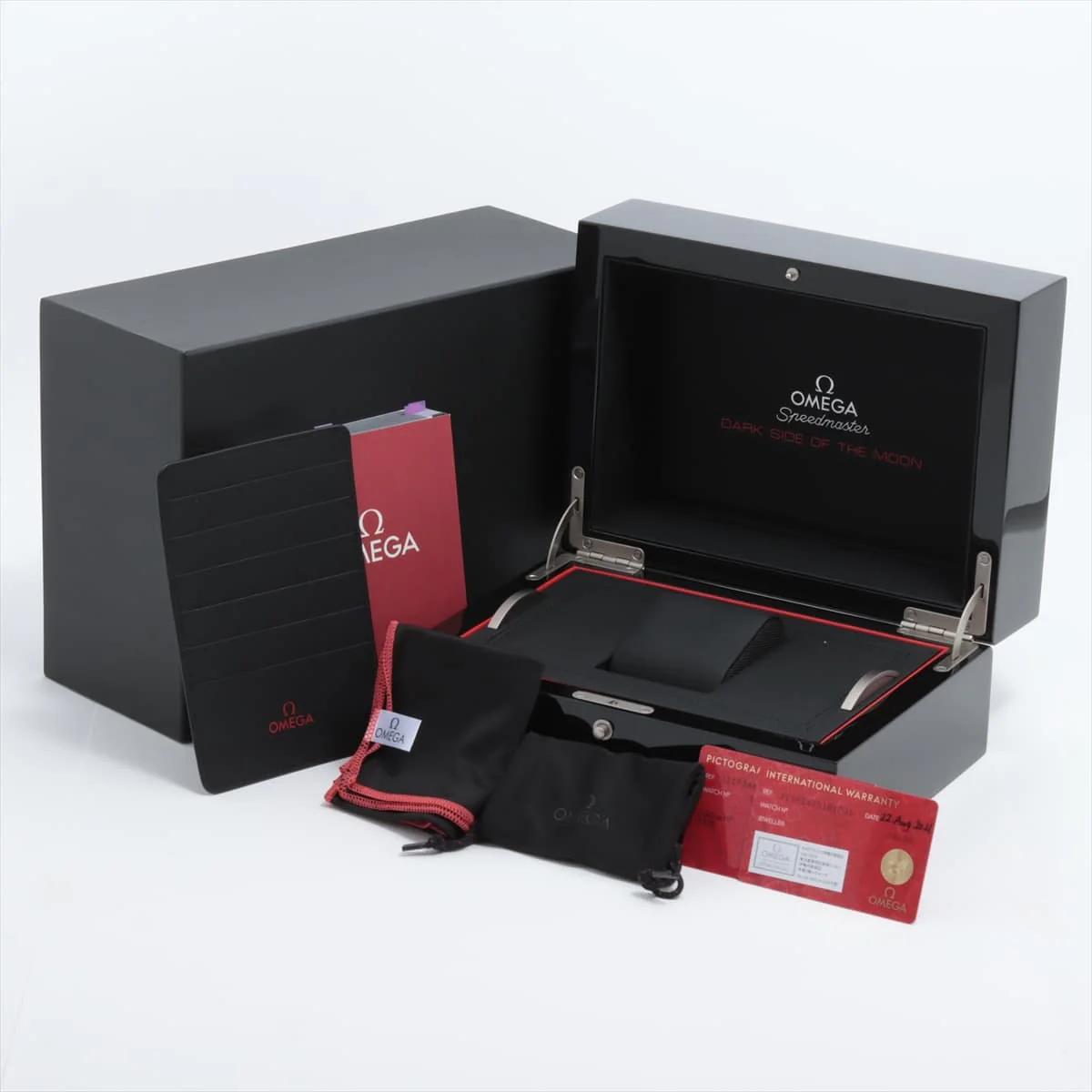 This Omega Speedmaster Dark Side Of The Moon 311.92.44.51.01.005 has a black baton dial and a fabric strap. This Omega has undergone a thorough inspection of accuracy, functionality and condition at our Omega certified service centre to determine the level of reconditioning required to meet our strict standards. It has also been checked against our records to ensure authenticity. All our watches have a 24-month warranty for your peace of mind.