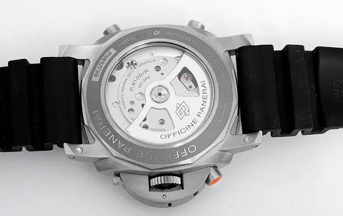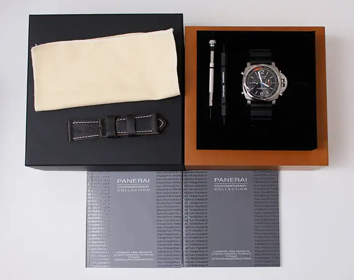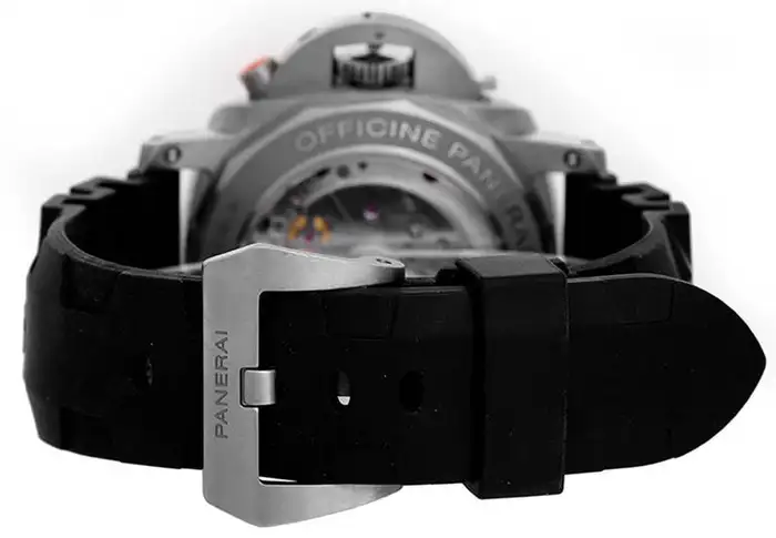 Titanium case with a black rubber strap. Fixed titanium bezel. Black dial with silver-tone hands and index hour markers. Arabic numerals mark the 6 and 12 o'clock positions. minute markers. regatta countdown around the outer rim. Dial Type: Analog. Luminescent hands and markers. Two sub-dials displaying: 60 second and 12 hour. Automatic movement with a 72 hour power reserve. Scratch resistant anti-relective sapphire crystal. Transparent sapphire case back. Case diameter: 47 mm. Round case shape. Tang clasp. Water resistant at 100 meters / 330 feet. Functions: chronograph, hour, minute, second, flyback, regatta countdown, knots scale. Luxury watch style. Watch label: Swiss Made. Panerai Luminor 1950 3 Day Chrono Flyback Regatta Black Dial Mens Watch PAM00526