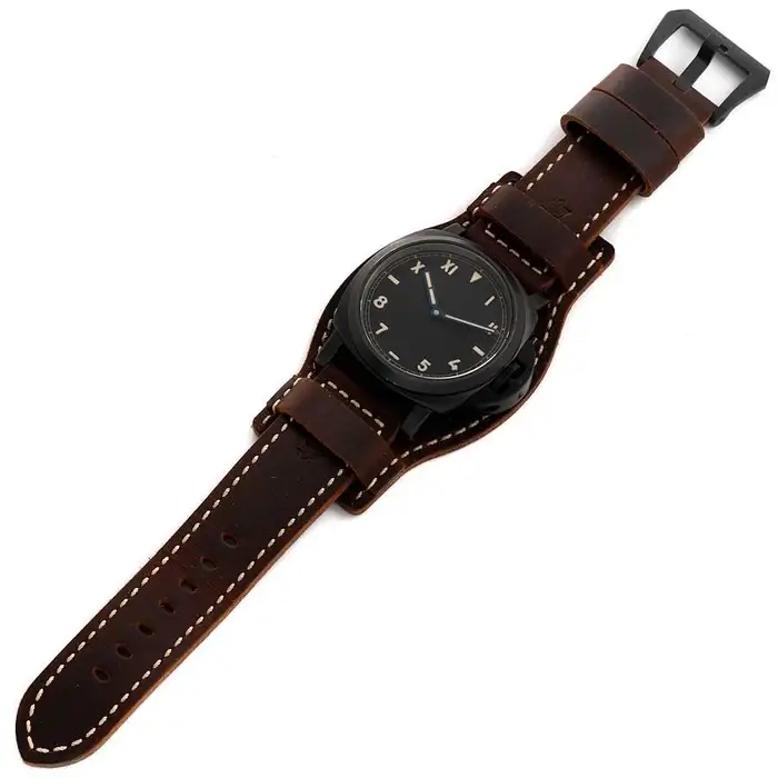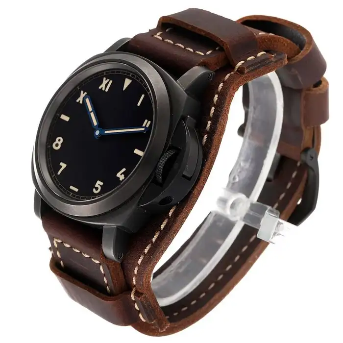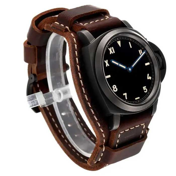 Black titanium case with a brown leather strap. Fixed black titanium bezel. Black dial with blue hands and Arabic, Roman numeral and index hour markers. Minute markers around the outer rim. Dial Type: Analog.Panerai Calibre P.5000 Hand Wind movement, containing 21 Jewels, composed of 127 parts, bitting at 21600 vph, and has a power reserve of approximately 192 hours. Scratch resistant sapphire crystal. Screw down crown. Solid case back. Round case shape. Case size: 44 mm. Tang clasp. Water resistant at 300 meters / 1000 feet. Functions: hour, minute. Dive watch style