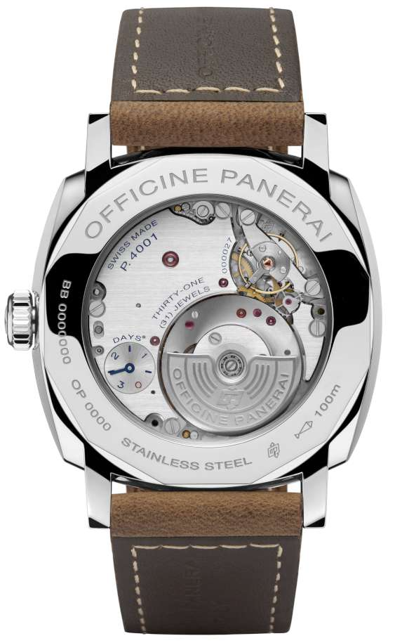 Stainless steel case with a brown leather strap. Fixed stainless steel bezel. Black dial with luminous silver-tone hands and index hour markers. Arabic numerals amrk the 6, 9 and 12 o'clock positions. Dial Type: Analog. Luminescent hands and markers. Date display at the 3 o'clock position. 24 hour (GMT) indicator. Panerai calibre P.4001 automatic movement with a 72-hour power reserve. Scratch resistant sapphire crystal. Transparent case back. Case size: 45 mm. Round case shape. Band width: 24 mm. Tang clasp. Water resistant at 100 meters / 330 feet. Functions: date, hour, minute, second, GMT, power reserve. Luxury watch style. Watch label: Swiss Made. Panerai Radiomir 1940 Automatic Men's Watch PAM00657