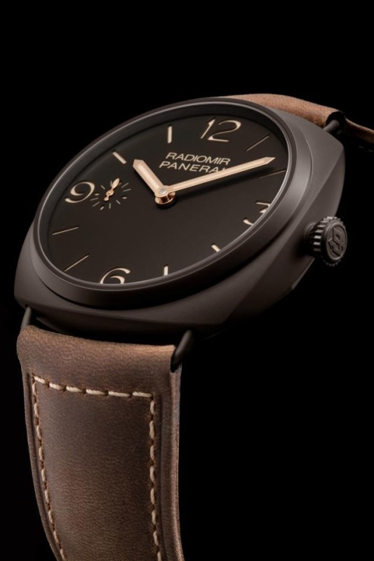Brown composite ceramic case with a brown leather strap. Fixed brown composite ceramic bezel. Brown dial with luminous hands and index hour markers. Arabic numerals mark the 3, 6, 9 and 12 o'clock positions. Dial Type: Analog. Small seconds sub-dial at the 9 o'clock position. Mechanical movement with a 72 hour power reserve. Scratch resistant sapphire crystal. Screw down crown. Transparent case back. Case diameter: 47 mm. Round case shape. Tang clasp. Water resistant at 100 meters / 330 feet. Functions: hour, minute, second. Luxury watch style. Watch label: Swiss Made. Panerai Radiomir Composite Brown Dial Brown Leather Mens Watch PAM00504
