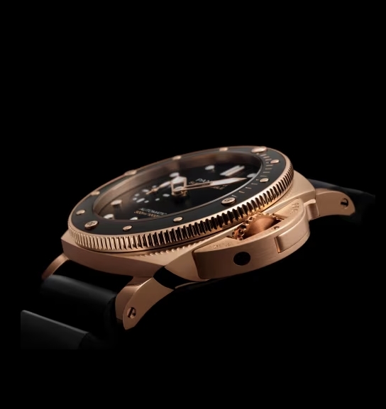 18kt rose gold case with a black alligator band. Fixed ceramic bezel. Black dial with index hour markers. Dial Type: Analog. Date display at the 3 o'clock position. Automatic movement. Scratch resistant sapphire crystal. Screw down crown. Transparent case back. Round case shape. Case size: 42 mm. Tang clasp. Water resistant at 100 meters / 330 feet. Functions: date, hour, minute, second. Luxury watch style. Watch label: Swiss Made. Panerai Submersible Automatic Black Dial Mens Watch