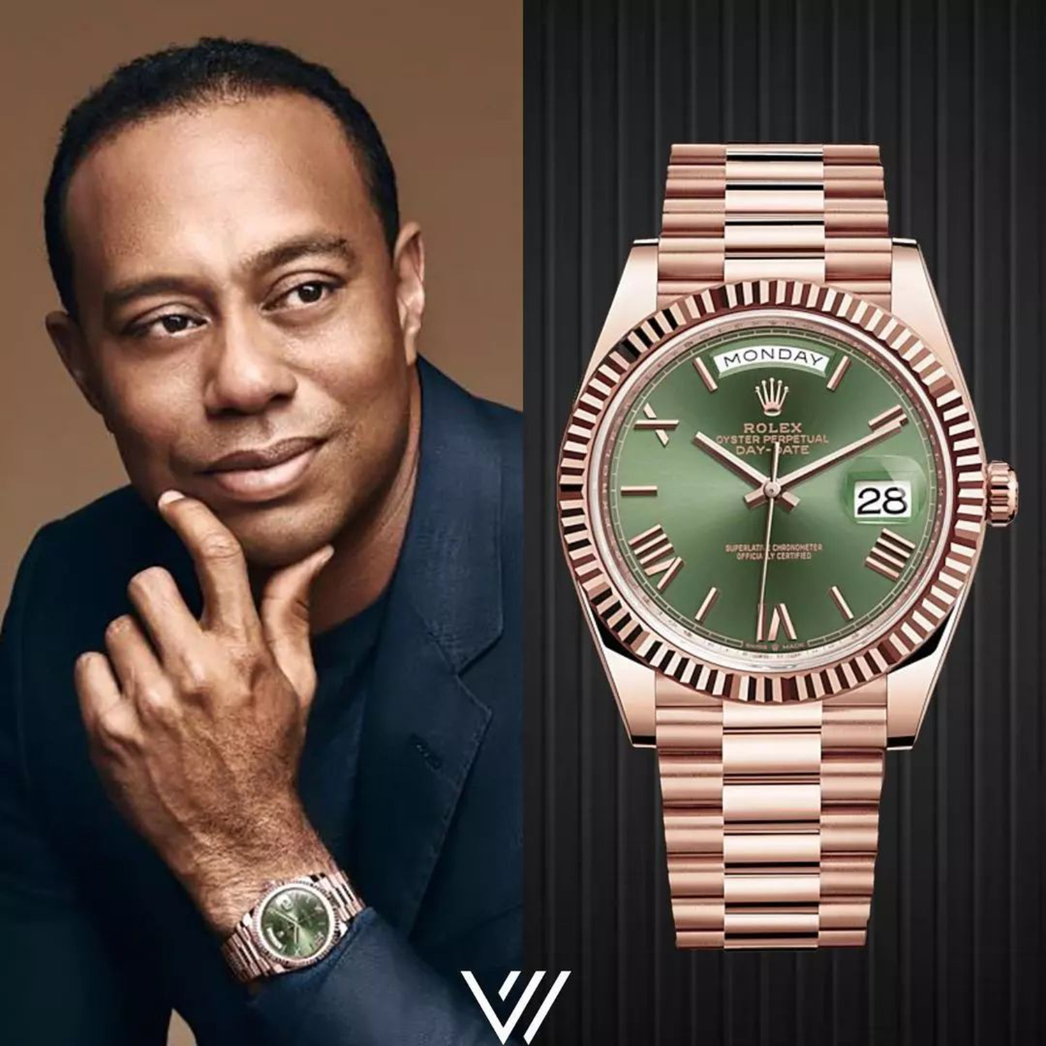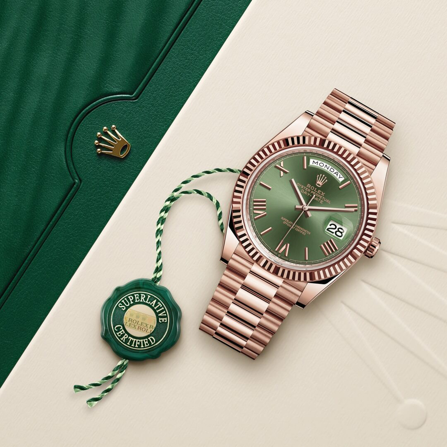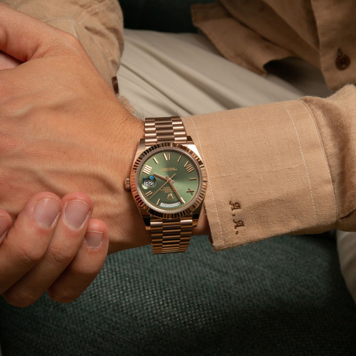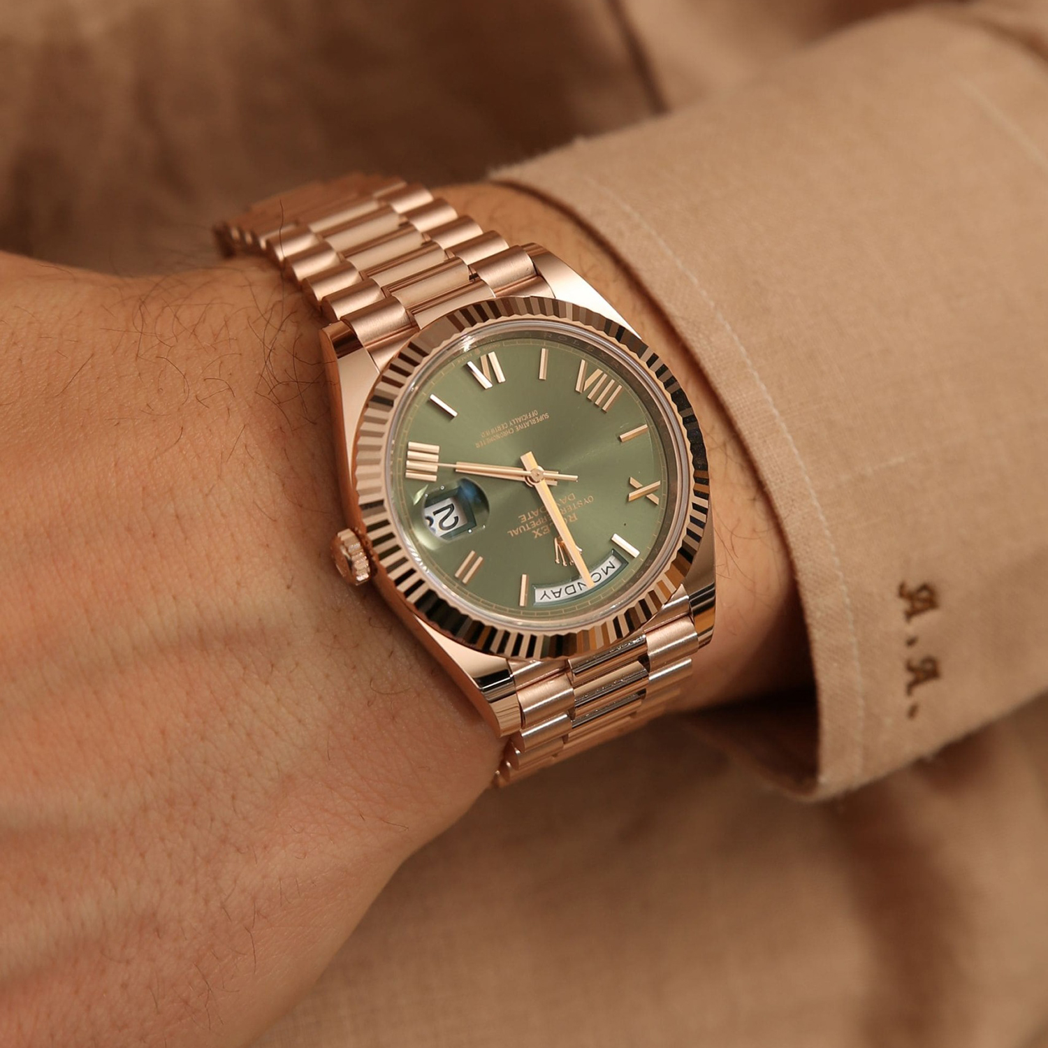 18kt Rose gold case with an 18kt rose gold president bracelet. Fixed fluted 18kt yellow gold bezel. Olive green dial with yellow gold hands and Roman numeral and index hour markers. Minute markers around the outer rim. Dial Type: Analog. Date display at the 3 o'clock position. Day of the week display centered on the 12 o'clock position. Automatic movement. Scratch-resistant sapphire crystal. Screw down crown. Solid case back. Case diameter: 40 mm. Round case shape. Fold-over clasp. Water-resistant at 100 meters / 330 feet. Functions: date, day, hour, minute, second. Luxury watch style. Watch label: Swiss Made.